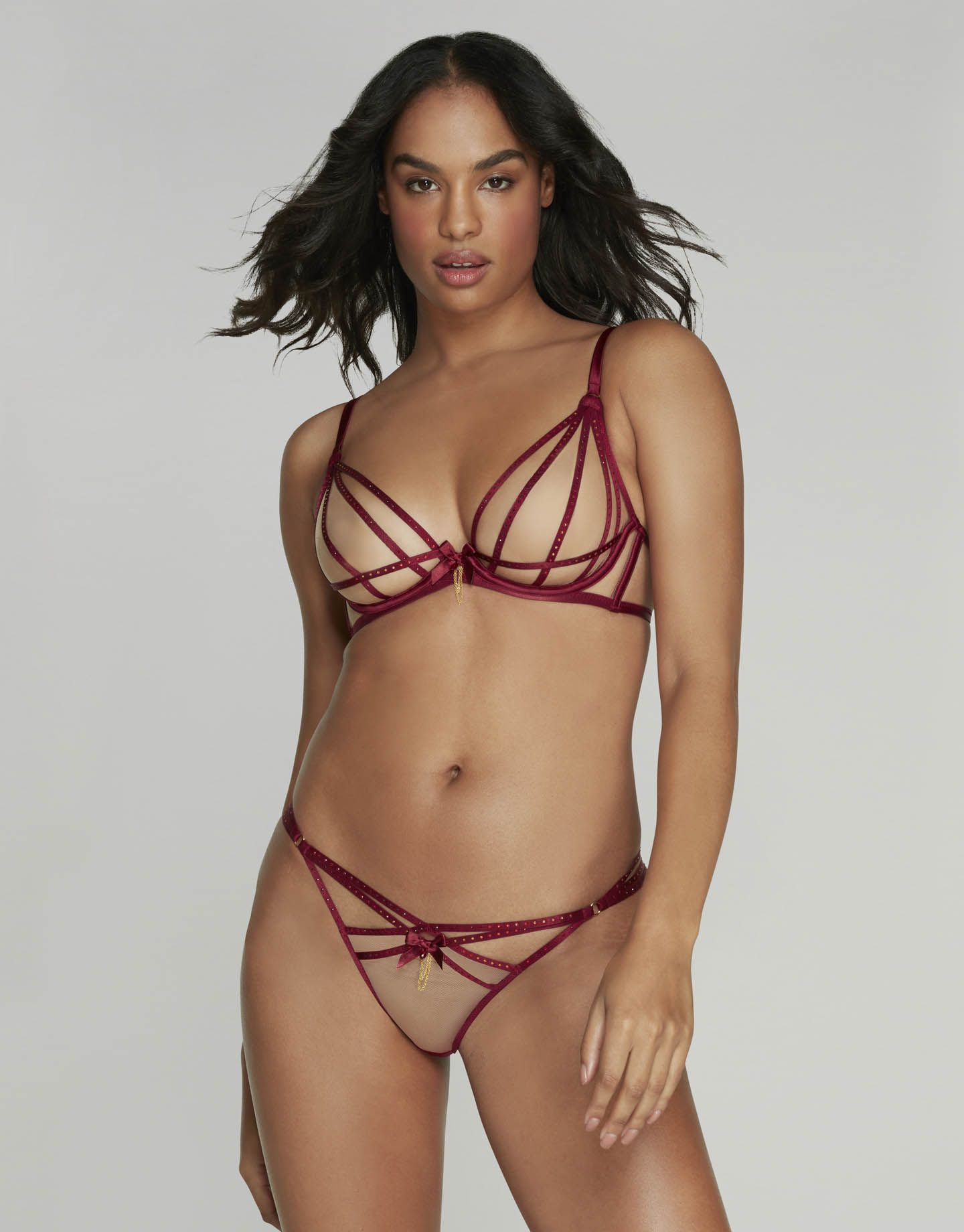 Идеальный компаньон для завершения образа в стиле коллекции Rubi - трусики стринг из прозрачного тюля. Обрамление эластичными лентами темно-бордового цвета, инкрустированными золотистыми стразами, погружает в эстетику декаданса и ночных клубов Лас-Вегаса.