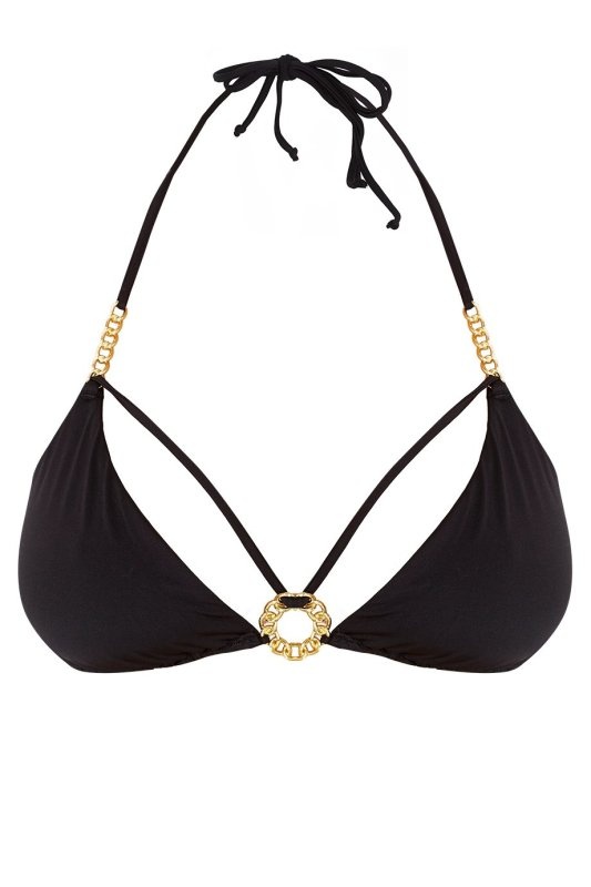 Cee-Cee – кульминация летнего очарования! Этот сногсшибательный гладкий черный купальник с мягкими треугольными чашками украшен декоративными лямками в зоне декольте и крупным золотистым кольцом. Лямки над чашками декорированы вставками из цепочек золотистого цвета, которые ярко сверкают на полуденном солнце.