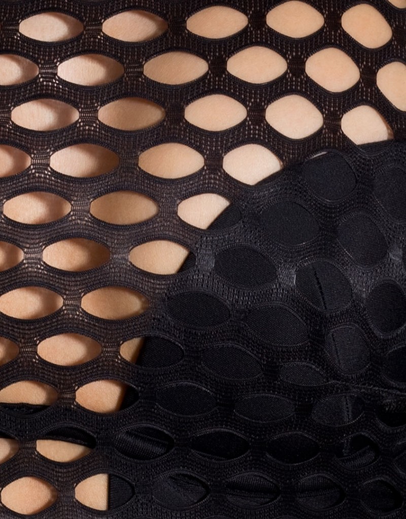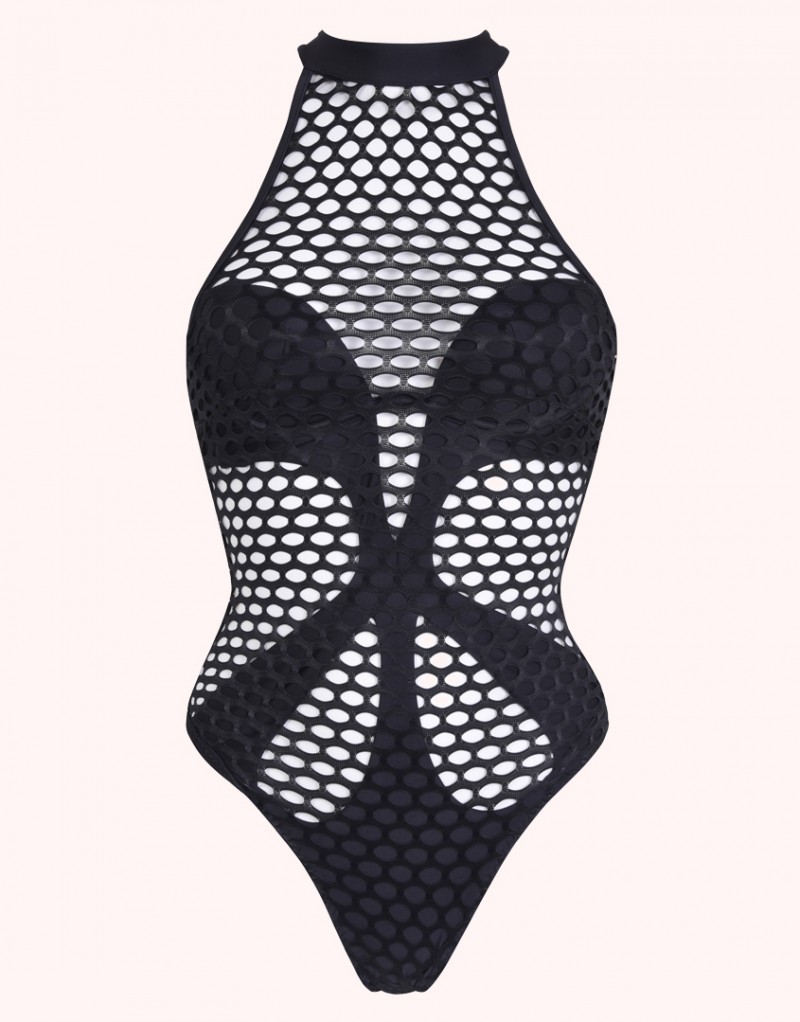 Артистичная Aziza - звезда нашей новой пляжной коллекции. Невообразимо сексуальный и ультра-модный купальник из крупной черной графичной сетки и микрофибры имеет плотный встроенный лиф на косточке, который красиво приподнимает и поддерживает грудь. Высокий воротник подчеркивает плечи и руки. Правильно расположенные вырезы по бокам не только соблазнительно обнажают тело, но и визуально делают фигуру еще более стройной. Сзади купальник застегивается на широкую молнию.