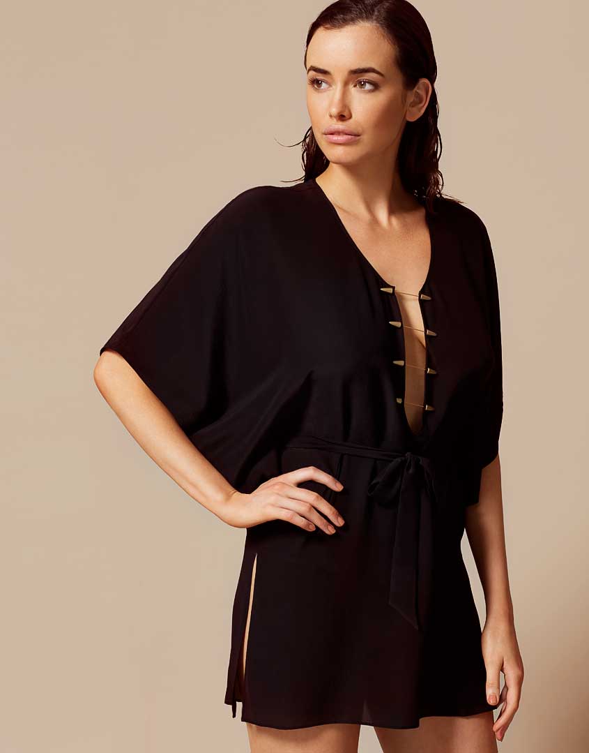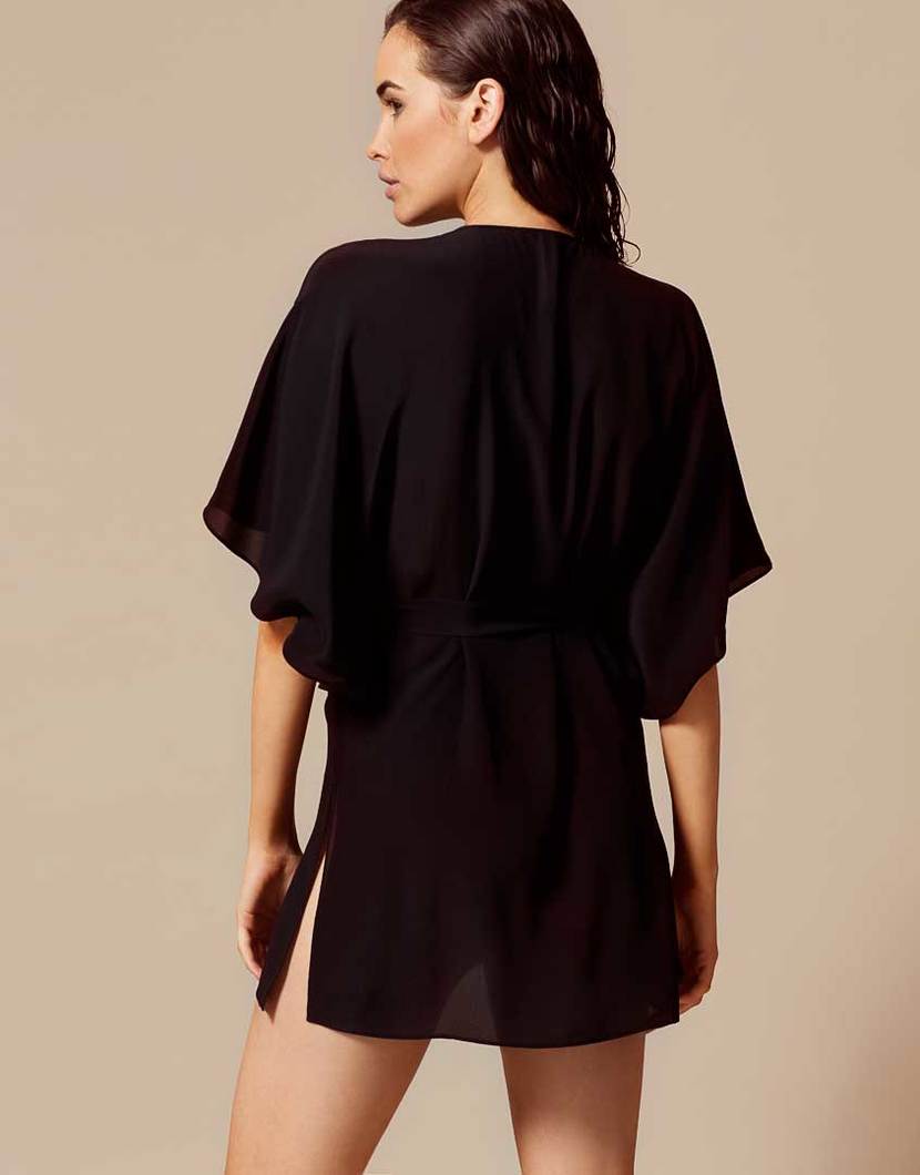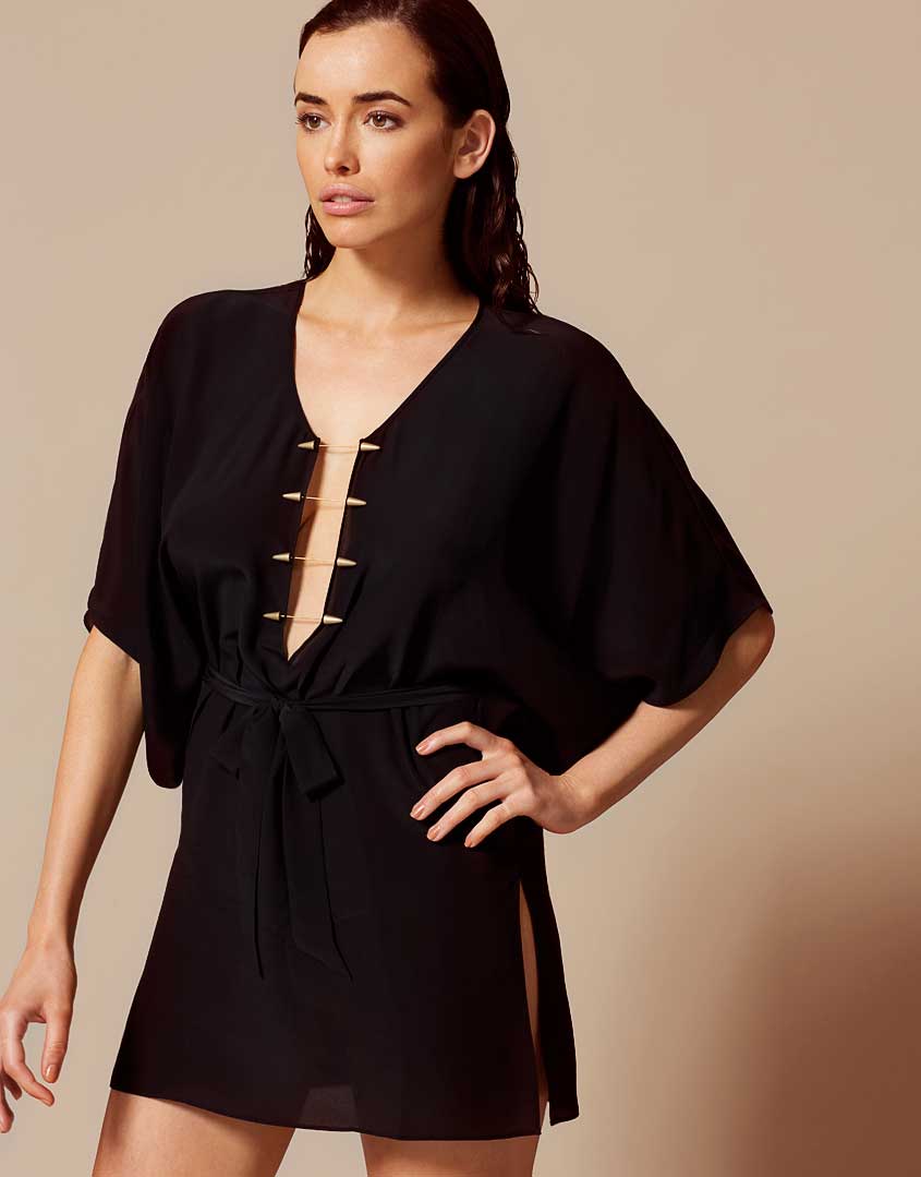 Оставайтесь элегантной на отдыхе в Sabine. Пляжная накидка изготовлена из легкого шелка-жоржета, мягкого наощупь и приятного к телу. Накидка в стиле кимоно с рукавами до локтей, полукруглым воротником и соблазнительным вырезом в зоне декольте, украшена золотистыми застежками. На талии есть снимающийся пояс. Длина Sabine позволяет продемонстрировать стройность загорелых ног. Дополните комплект бикини Agent Provocateur и любимым коктейлем.
