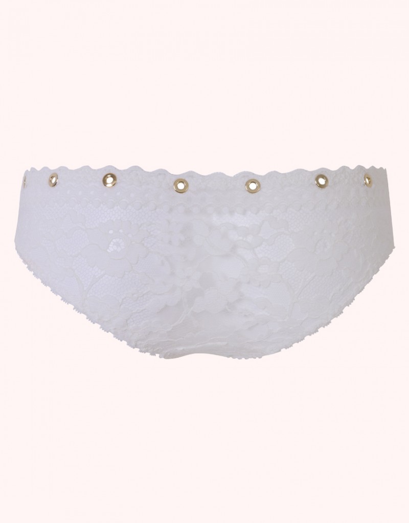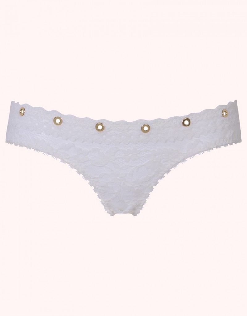 Стань центром притяжения в озорном Stevie! Классические трусики с низкой посадкой выполнены из французского кружева и украшены вдоль талии золотыми клепками, которые сверкают на свету и придают образу еще больше привлекательности. Поразительная, бескомпромиссная красота этого комплекта захватывает дух!