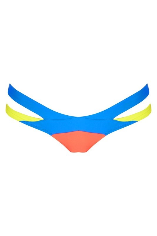 Новая версия бестселлера Mazzy: классический бандажный купальник в сочетании ярко-желтого, кораллового и светло-синего цветов. Эти плавки сразу привлекают внимание и искусно подчеркивают формы благодаря перекрещивающимся лямкам, обнажающим тело на бедрах. Спортивные и сексуальные, эти плавки с низкой посадкой имеют высокие вырезы вдоль линии ног, визуально удлиняя их.