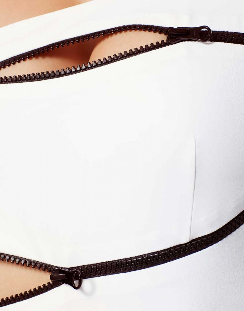 Наслаждайтесь солнечными ваннами на яхте в новом сексуальном купальнике Zoey. Спортивная модель в стиле 90-х, обтягивающий белый купальник с лямкой на одно плечо украшен контрастными черными молниями в области груди и на бедрах. Высокие трусики зрительно удлиняют ноги. Носите застегнутым для создания лаконичного спортивного образа и расстегивайте Zoey, когда хочется продемонстрировать немного больше.