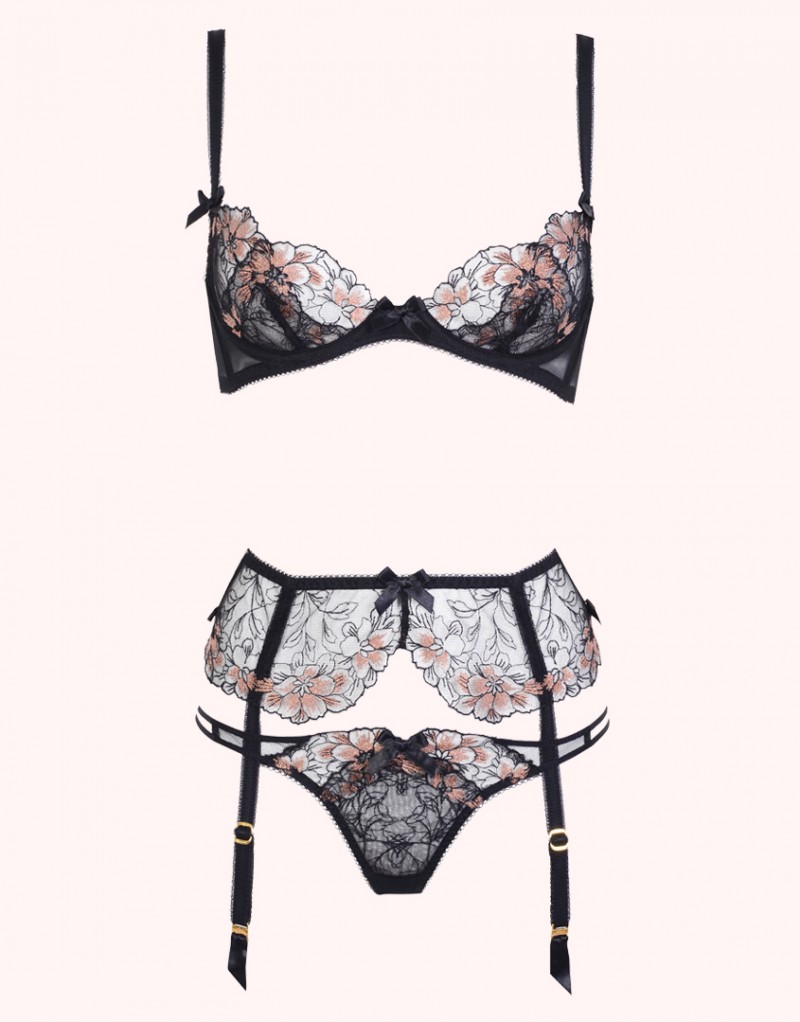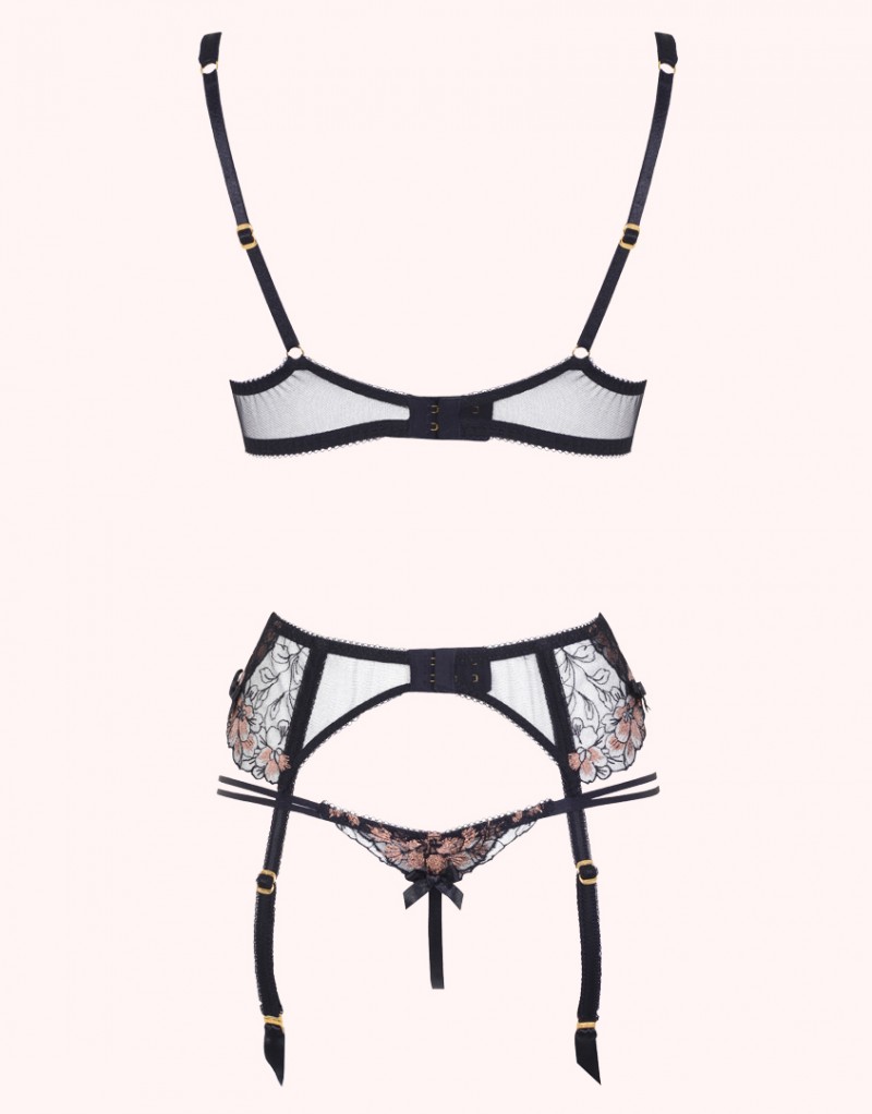 Глубина черного цвета прекрасно оттеняет мерцающую бронзу восхитительного комплекта Laleh! Роскошные трусики стринги из мелкой черной сетки украшает изысканная цветочная вышивка из нитей бронзового люрекса с розовым отливом. Двойные эластичные лямки по бокам и сатиновые бантики спереди и сзади завершают образ. Трусики идеально сочетаются с поясом и бюстгальтером Laleh.