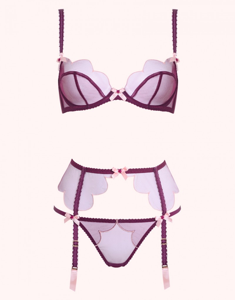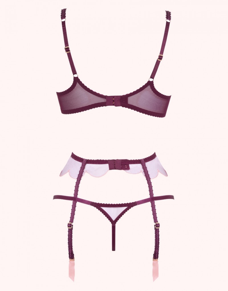 Легендарная Lorna возвращается в новом, улучшенном дизайне. Элегантные женственные трусики стринги из полупрозрачного тюля с контрастной бордовой окантовкой и волнистым узором украшают бледно-розовые сатиновые бантики с розовыми бутонами.