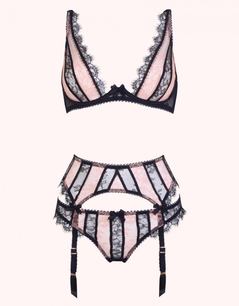 Поразительная Saffi - настоящая звезда новой коллекции Agent Provocateur, сочетание яркого современного дизайна и нежного женственного кружева. Пояс с контрастными панелями черного и персикового цвета оторочен по бокам маленькими кружевными рюшами и украшен черными сатиновыми бантиками на талии и пажах. Кружевные вставки сзади и золотисто-розовая фурнитура завершают образ.