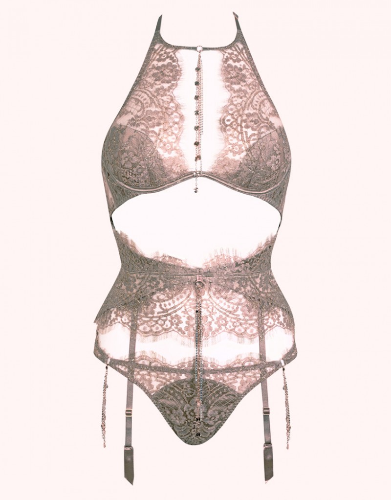 Комплект Gayle из деми-кутюрной коллекции Soiree, поражающий обилием деталей и роскошным мерцающим блеском, подходит для особого случая. Трусики из мягкого золотого кружева ливерс с добавлением нитей мерцающего люрекса спереди украшает полукруглая панель с ажурным краем. Колечки золотистой фурнитуры на бедрах декорированы блестящими металлическими цепочками с небольшими монетками, что придает модели восточное очарование.