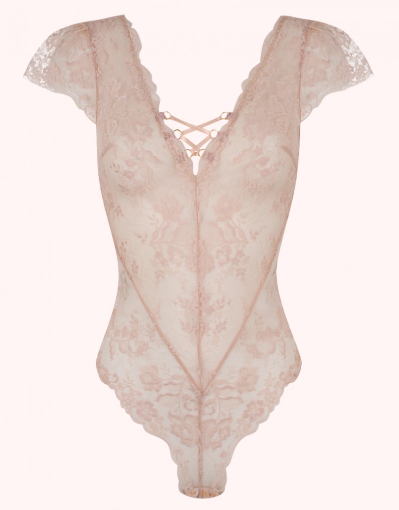Захватывающее сочетание мягкой женственности и брутальной шнуровки будоражит воображение. Это сексуальное боди можно носить не только в спальне, но и в сочетании с джинсами для создания игривого образа. Обтягивающее боди персикового цвета с глубоким V-образным вырезом и ажурными рукавами создано из роскошного кружева ливерс. Шелковая лента, продетая сквозь золотисто-розовые колечки, создает бандажный эффект в области декольте. Соблазнительный вырез на спине акцентирован маленькой розовой застежкой.