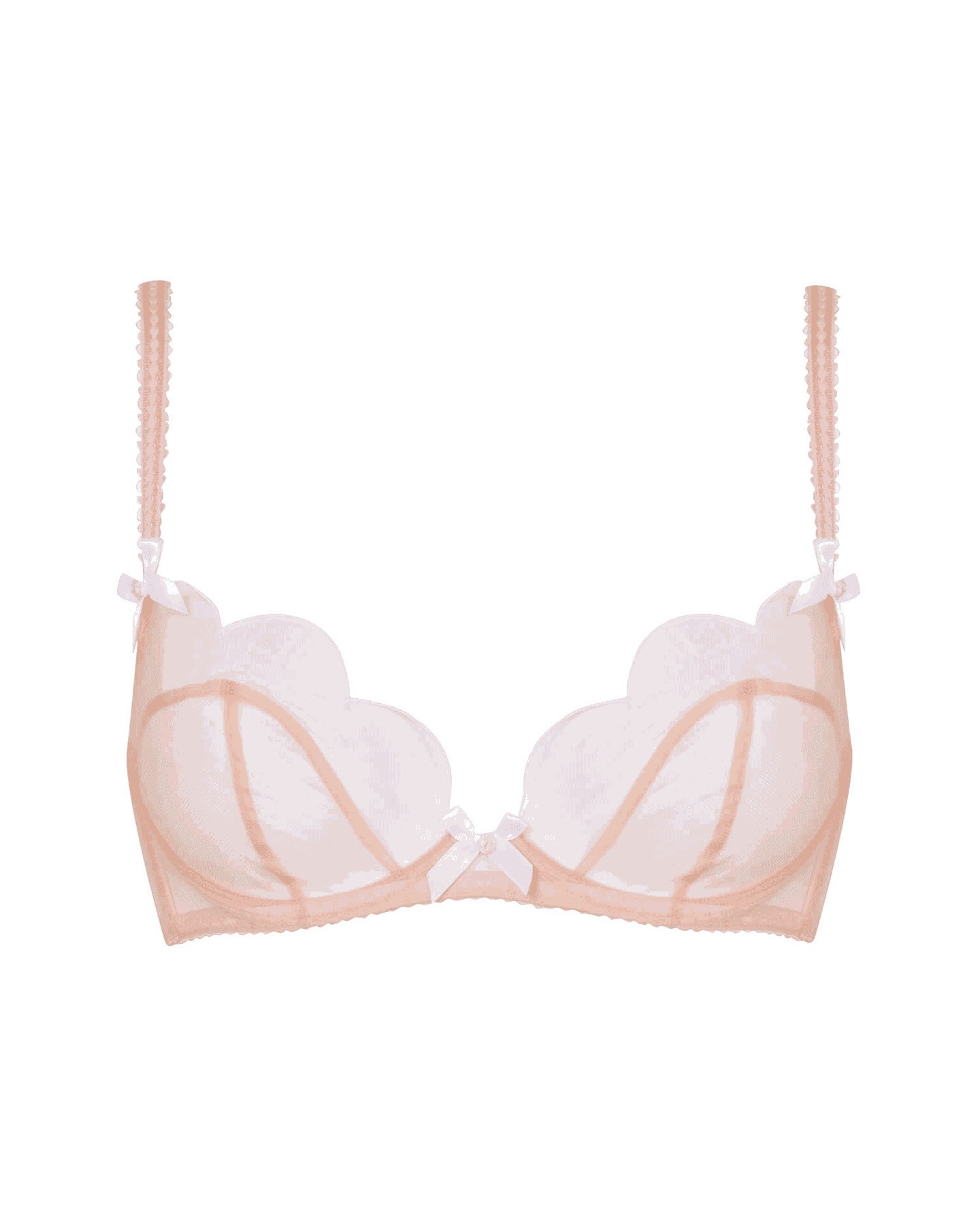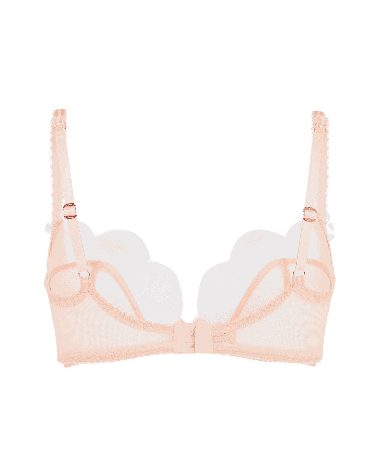 Элегантный женственный бюстгальтер с глубокой чашкой Lorna выполнен из полупрозрачного телесного тюля с окантовкой по краю. На бретелях и между чашек бюстгальтер украшают белые сатиновые бантики с розовыми бутонами. Образ дополнен застежкой из золотисто-розового металла.