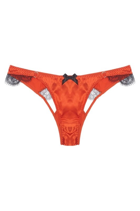 Игривая Kacie добавит масла в огонь! Бюстгальтер в стиле 1970-х годов из ярко-оранжевого шелка стрейч оторочен по бокам изысканным черным кружевом ливерс. Чашки на косточках дразняще подчеркивают декольте. Перекрещивающиеся на спине лямки, черный бантик между чашек и золотистая фурнитура завершают этот великолепный образ.