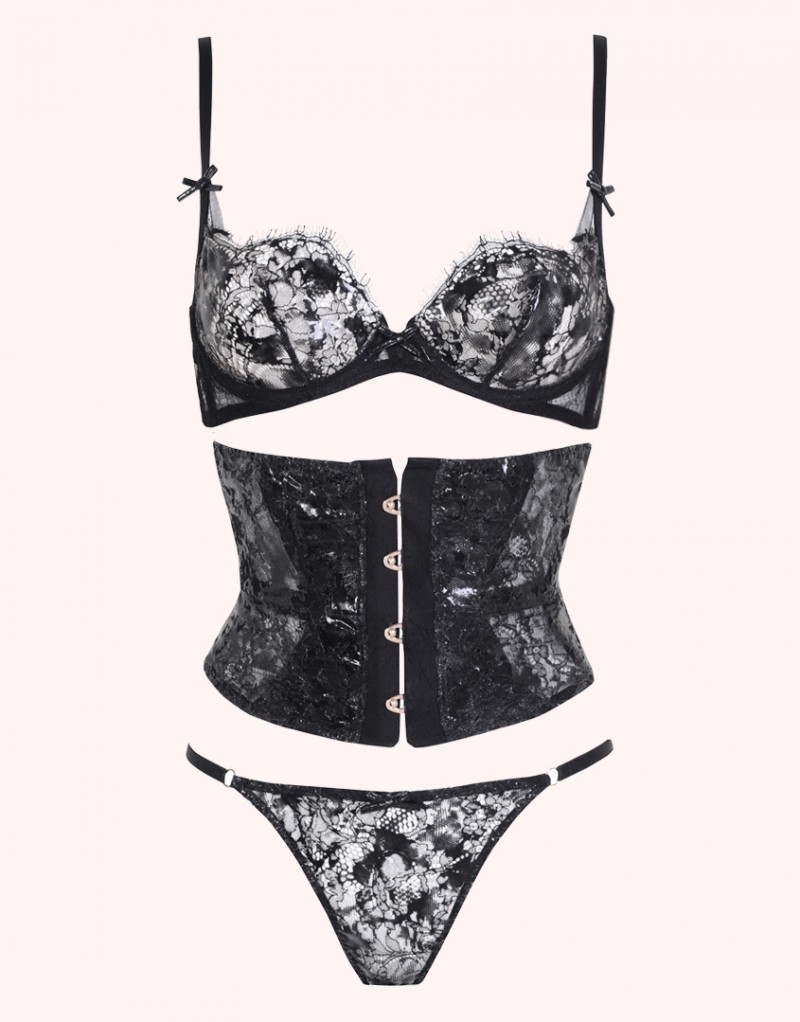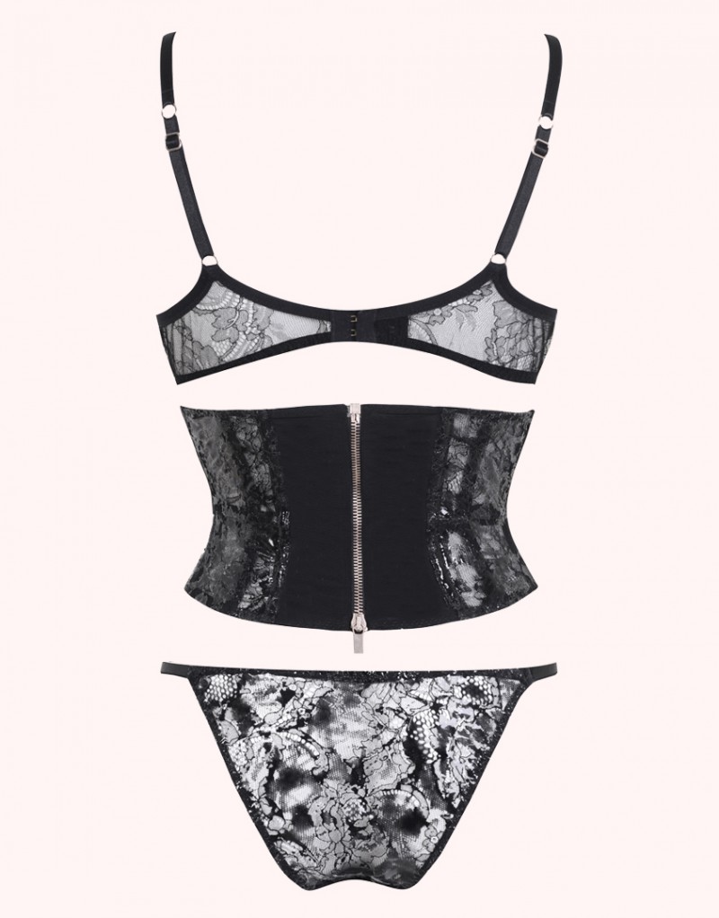 Deziree восхищает потряающим сочетанием утонченной женственности и неприкрытой сексуальности. Черный бюстгальтер с половинной чашкой из французского кружева ливерс вручную покрыт силиконом по уникальной технологии, которая придает ткани блестящий, лаковый эффект. Чашки также оторочены тончайшим кружевом по краю. Черный бантик между чашек с сияющей подвеской в форме капли завершает образ. Deziree - модель из деми-кутюрной коллекции Soiree.