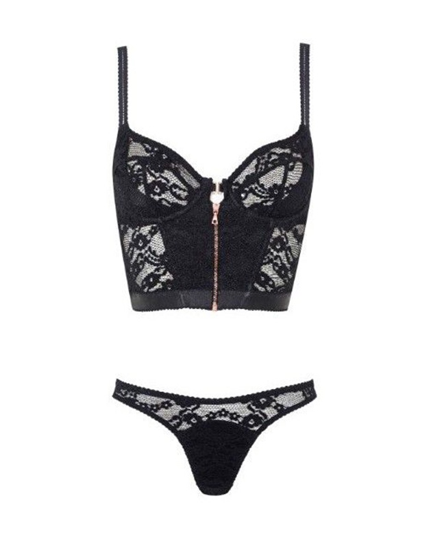 Откровенно сексуальная и подчеркивающая фигуру Sally – pin up королева этого сезона. Удлиненный черный бюстгальтер - современная интерпретация классических моделей 50-х годов. Созданный из роскошного кружева стрейч и крупной сетки, бюстгальтер на косточках с глубокой чашкой заканчивается широкой эластичной лентой, обеспечивающей дополнительную поддержку. Лямки украшены черной вышивкой по центру. Между чашками имеется золотисто-розовая молния. Дразнящие полупрозрачные панели по бокам и классическая застежка на крючки завершают образ.