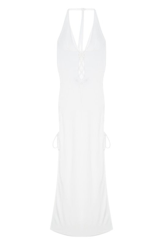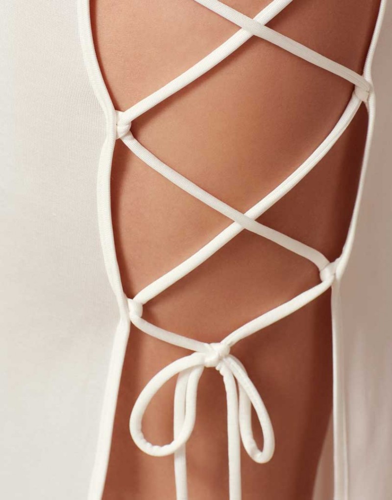 Traci - эффектная и дерзкая длинная накидка. Открытая спина и глубокие вырезы вдоль подола и в области декольте делают образ откровенно сексуальным, а швы под мягкими чашками обеспечивают необходимую поддержку. Вырезы украшает соблазнительная шнуровка. Traci удобно надеть поверх бикини, чтобы прогуляться в бар за коктейлем.