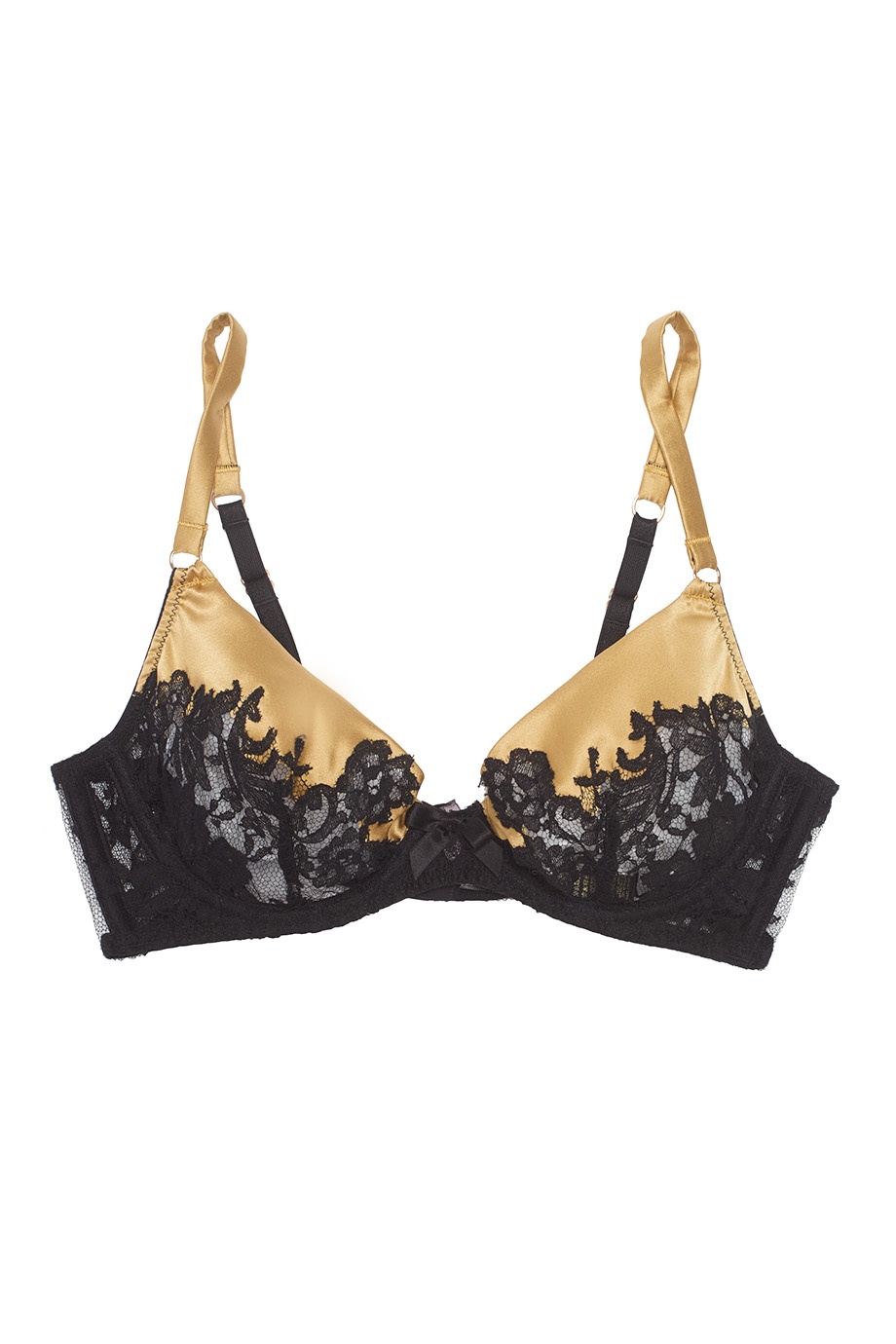 Nayeli - это великолепное сочетание бескомпромиссной роскоши и абсолютного изящества. Золотой бюстгальтер выполнен в особой традиционной технике: аппликации черного французского кружева ливерс украшают шелковую базу чашек, создавая привлекательный микс текстуры и яркого цвета. Черный шелковый бантик между чашек и кружевная спинка завершают образ. Сочетайте с другими моделями деми-кутюрной коллекции Nayeli.