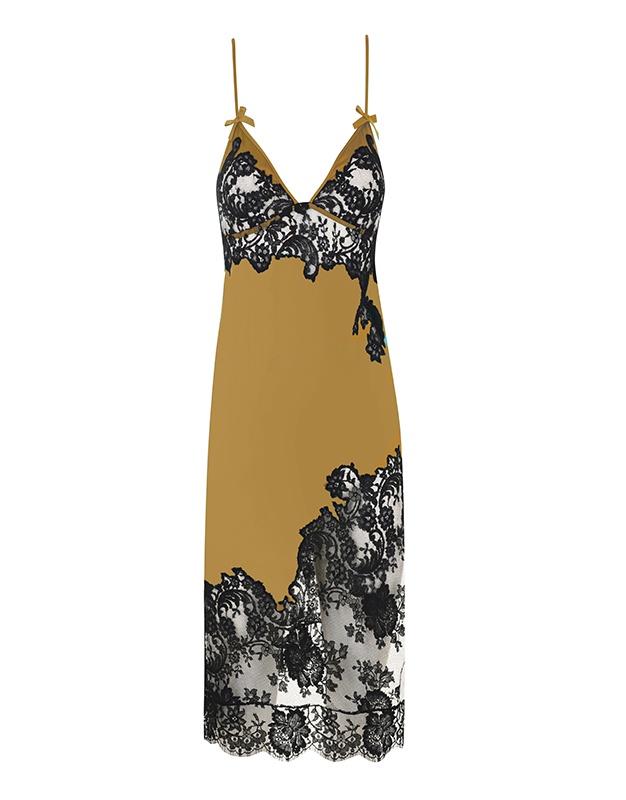 Nayeli - это великолепное сочетание бескомпромиссной роскоши и абсолютного изящества. Золотая сорочка выполнена в особой традиционной технике: аппликации черного французского кружева ливерс украшают шелковую базу, создавая привлекательный микс текстуры и яркого цвета. Сорочка с мягкими чашками и тонкими регулируемыми лямками декорирована кружевным подолом. Пуговицы и вырез придают этой модели романтичное очарование. Сочетайте с другими моделями деми-кутюрной коллекции Nayeli или носите вместе с черным блейзером или кожаной курткой.