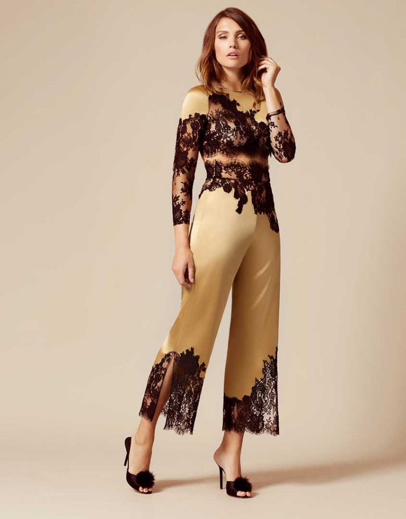 Nayeli - это великолепное сочетание бескомпромиссной роскоши и абсолютного изящества. Золотой кроп-топ выполнен в особой традиционной технике: аппликации черного французского кружева ливерс украшают шелковую базу, создавая привлекательный микс текстуры и яркого цвета. Топ с длинными рукавами декорирован по низу черным кружевом. Восхитительный подарок, этот топ прекрасно сочетается с другими моделями деми-кутюрной коллекции Nayeli. Наденьте его на выход для создания роскошного вечернего образа.