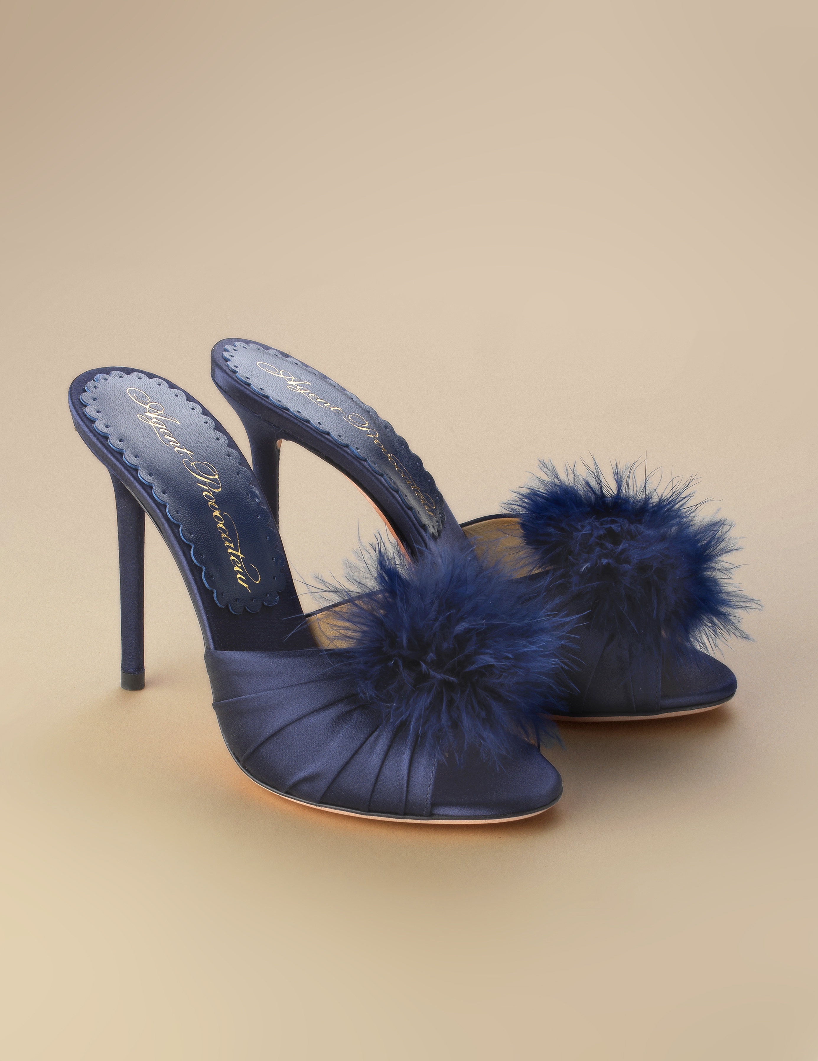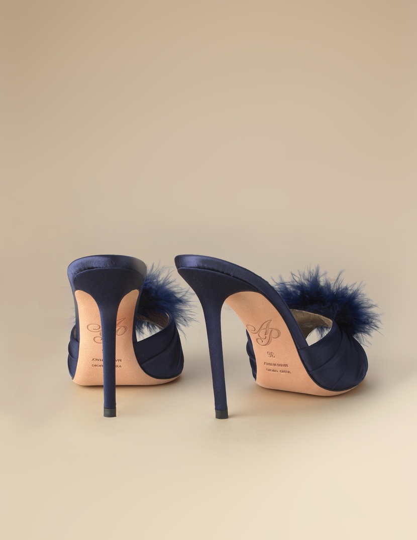 Новинка классического будуара от AP - атласные туфли на каблуке с кокетливым декором из перьев марабу. Туфли темно-синего цвета из королевского шелкового атласа дополнены кружевной стелькой с фирменной надписью АР. Высота каблука: 110 мм