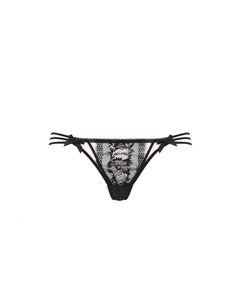 Tanya - это сочетание красоты и чувственного дизайна. Черные трусики с низкой посадкой в стиле 60-х выполнены из французского кружева Ливерс и шелка-стрейч. Провокационный треугольный вырез сзади, эластичные ленты в бондажном стиле и маленькие сатиновые бантики завершают образ.