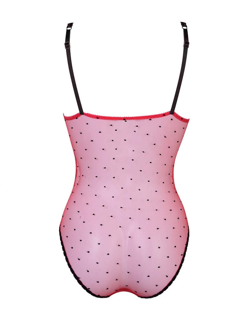 Смелая кокетливая Poppie - новая коллекция из полупрозрачного тонкого тюля с вышитым контрастным узором. Гладкое боди красного цвета с полукруглым вырезом выполнено в стилистике 1960-х годов. Боди украшено черной кружевной оторочкой вдоль линии декольте и бедер и черными бантиками. Образ дополняют отстегивающиеся пажи. Забавная, классическая модель, которая найдет место и в дневном, и в вечернем гардеробе.