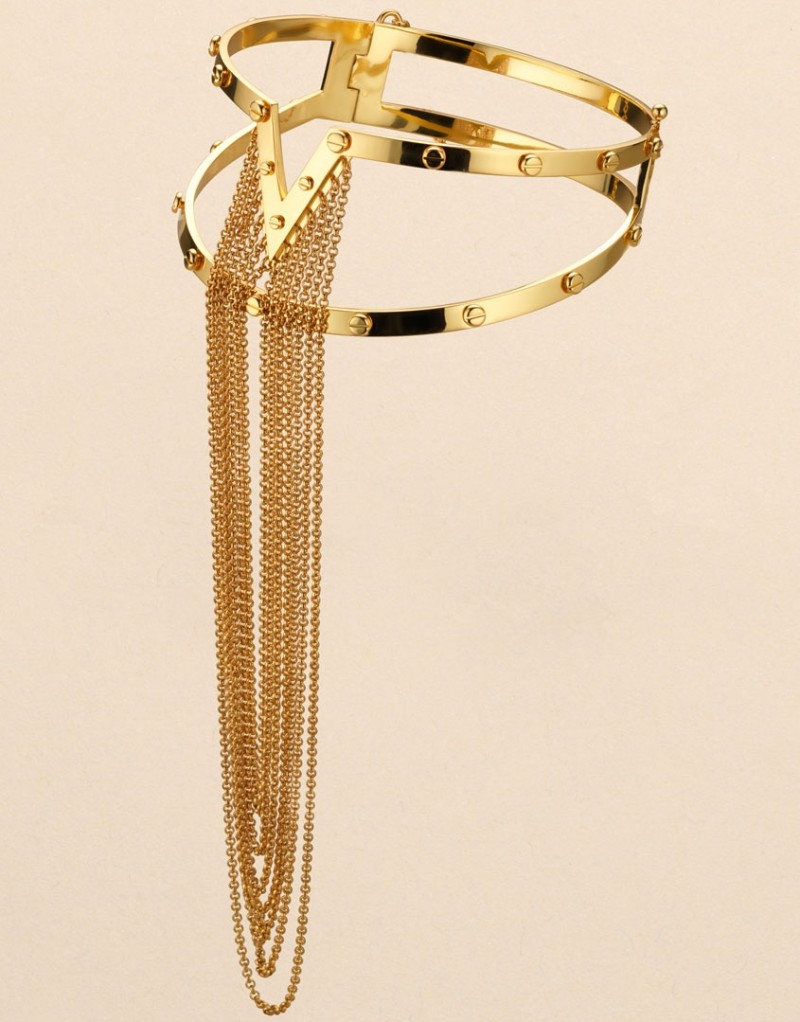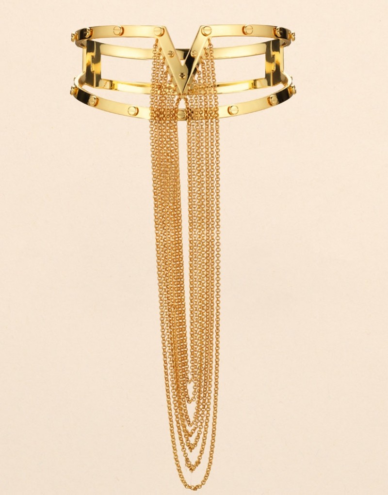 Почувствуйте себя супер-героиней в новой коллекции аксессуаров Zeusanna. Эффектное позолоченное колье с футуристичным узором шеврон и золотистыми клепками дополняют драпировки из тонких цепочек, которые завораживающе переливаются при каждом движении.