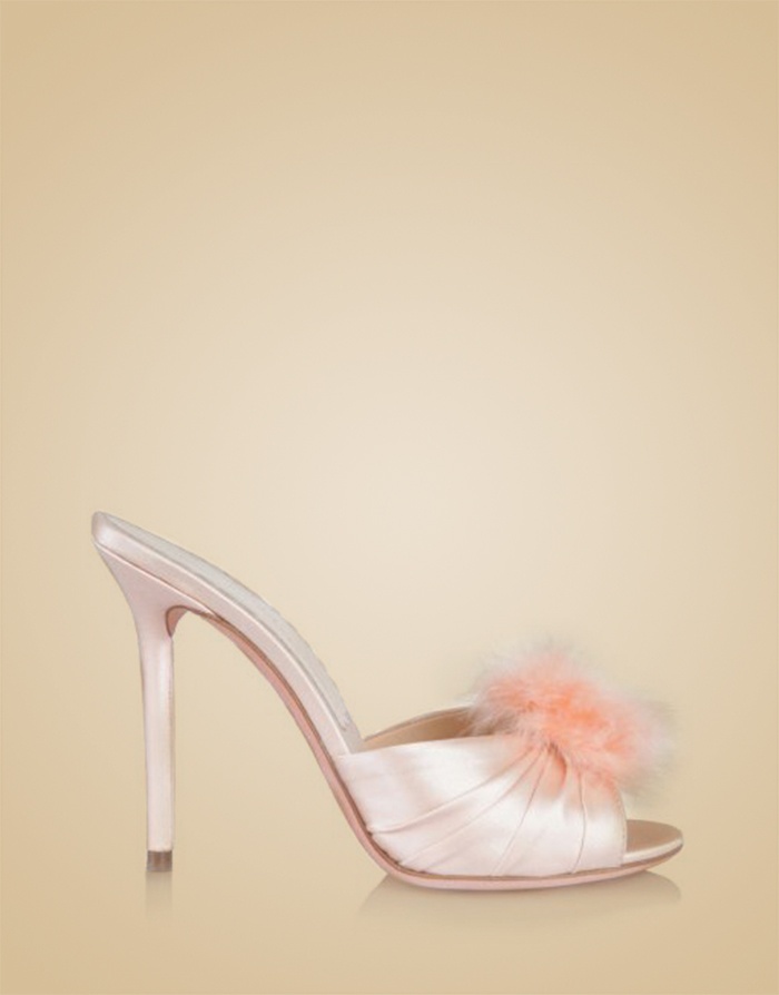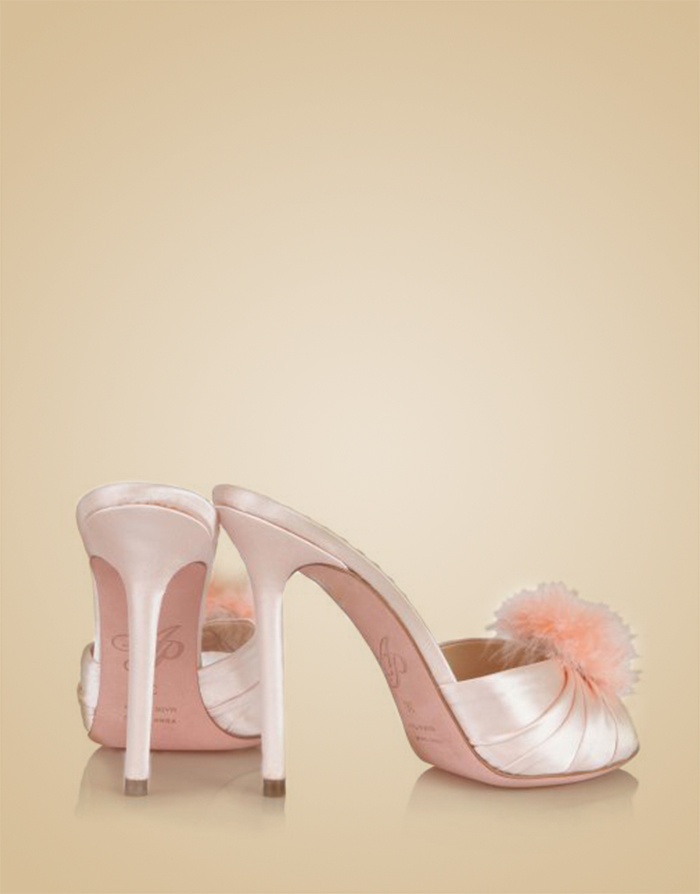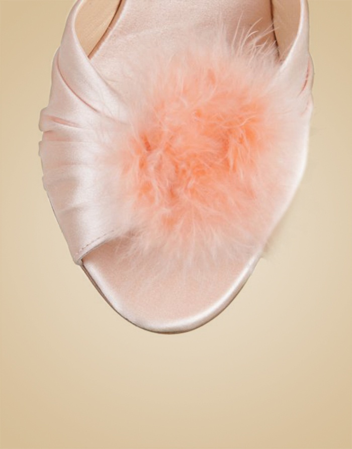 Новинка классического будуара от AP - атласные туфли на каблуке с кокетливым декором из перьев марабу. Туфли нежно-розового цвета из королевского шелкового атласа дополнены кружевной стелькой с фирменной надписью АP.
