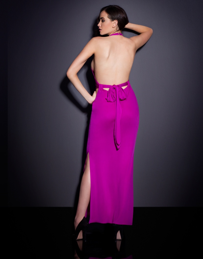 Вдохновленное ретро стилем 70-х годов, платье в пол Terese выполнено из шелкового джерси. Платье с высокой горловиной скользит вниз по телу, акцентируя внимание на изгибах тела. Широкий пояс завязывается на спине и подчеркивает талию, боковые разрезы от колена завершают дерзкий соблазнительный образ.