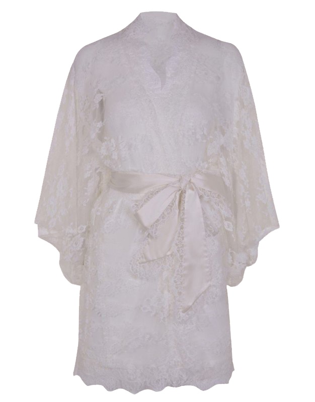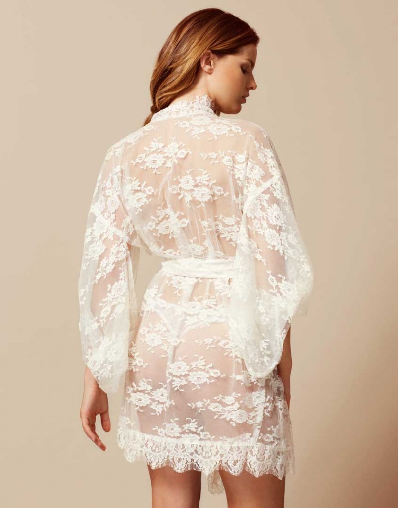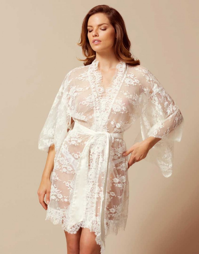 Изумительное прозрачное кимоно из французского кружева с роскошным цветочным узором. В комплекте с сатиновым поясом, окаймленным кружевом, выглядит особо привлекательно. Представлено в черном и белом цвете.