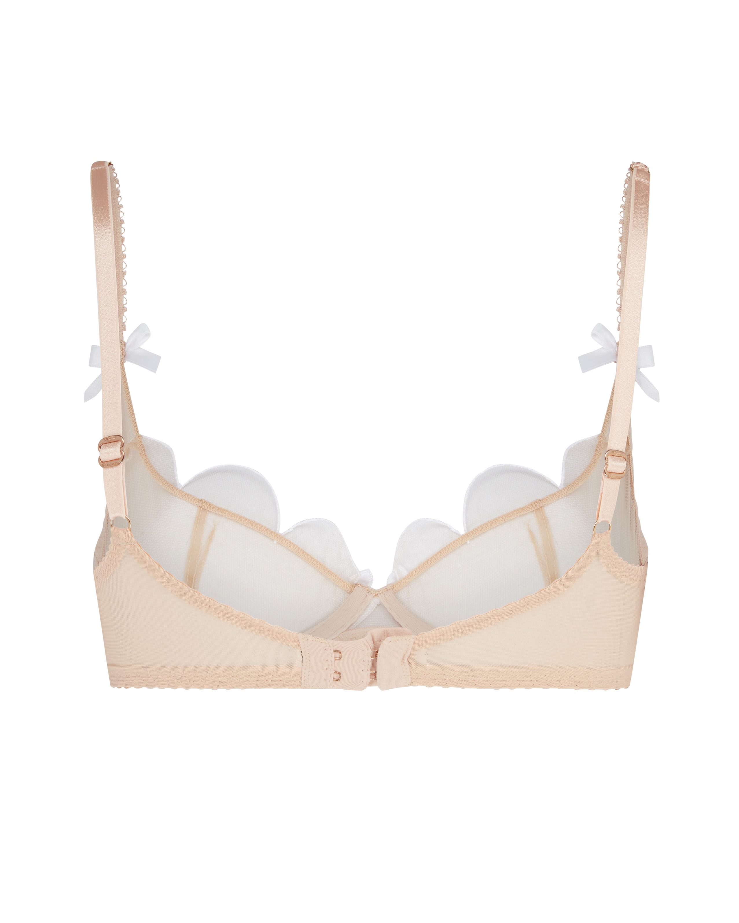 Lorna — классика вне времени. Этот бюстгальтер нежного телесного цвета выполнен из тюля и почти сливается с кожей, создавая нюдовый эффект. Края чашечек украшены белой изящной фестончатой вышивкой. Бюстгальтер на косточках, застежка сзади на крючки. Дополните образ трусиками Lorna в тон.