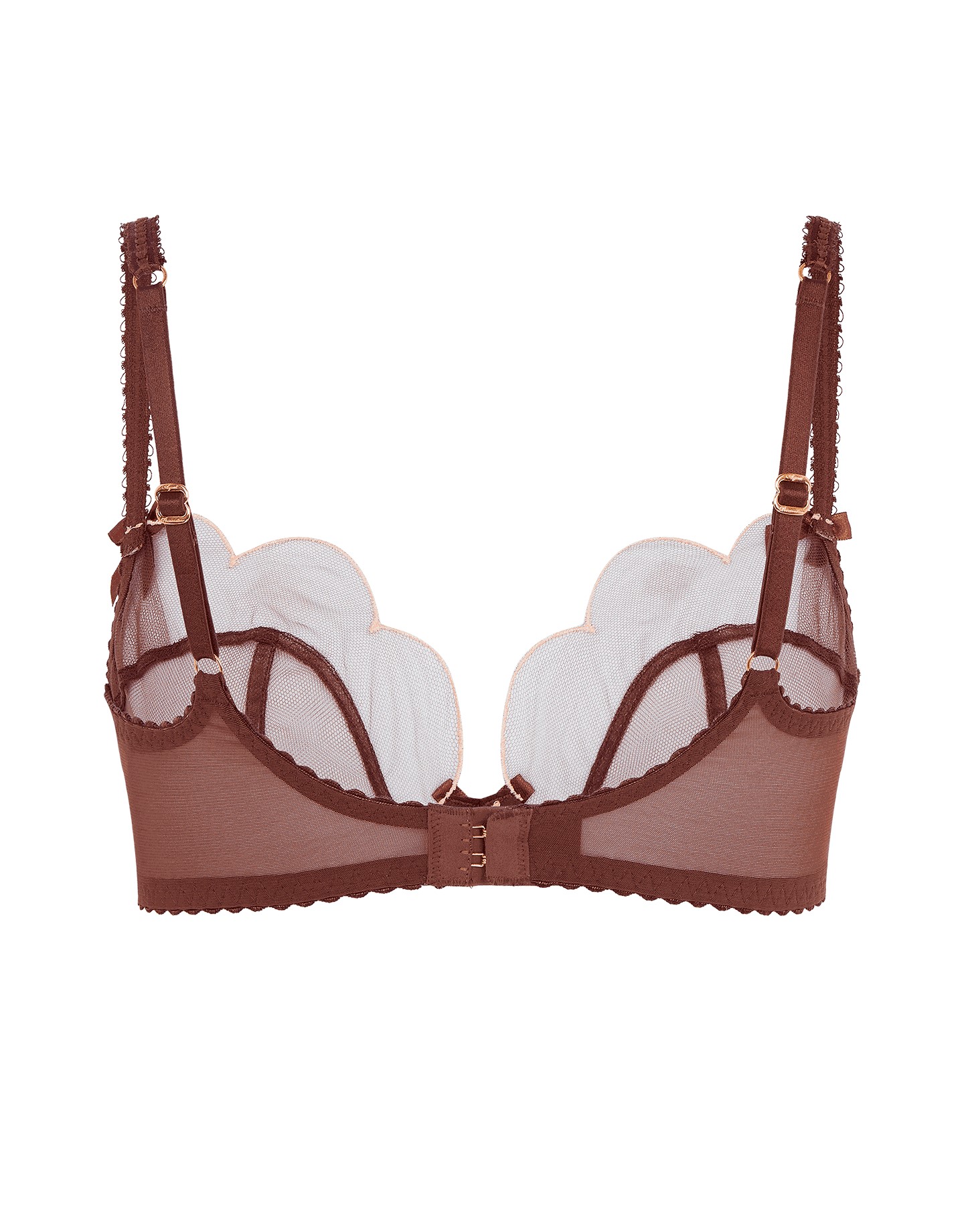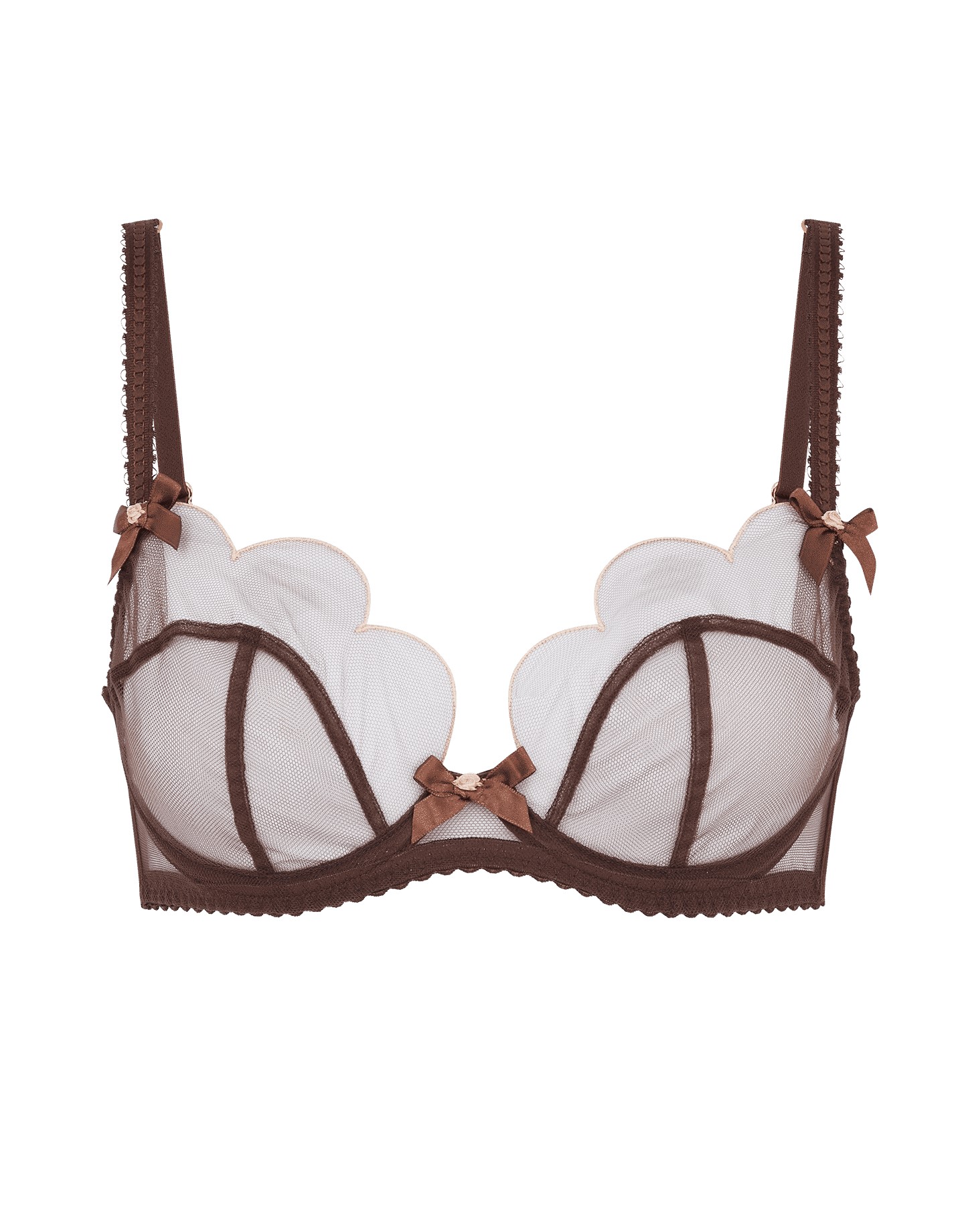 Классический глубокий бюстгальтер на косточках с тройным швом на чашке выполнен из тонкого коричневого полупрозрачного тюля и украшен персиковой оторочкой по ажурному краю. Коричневые сатиновые бантики с розовыми бутонами завершают образ. Идеален для ежедневной носки.