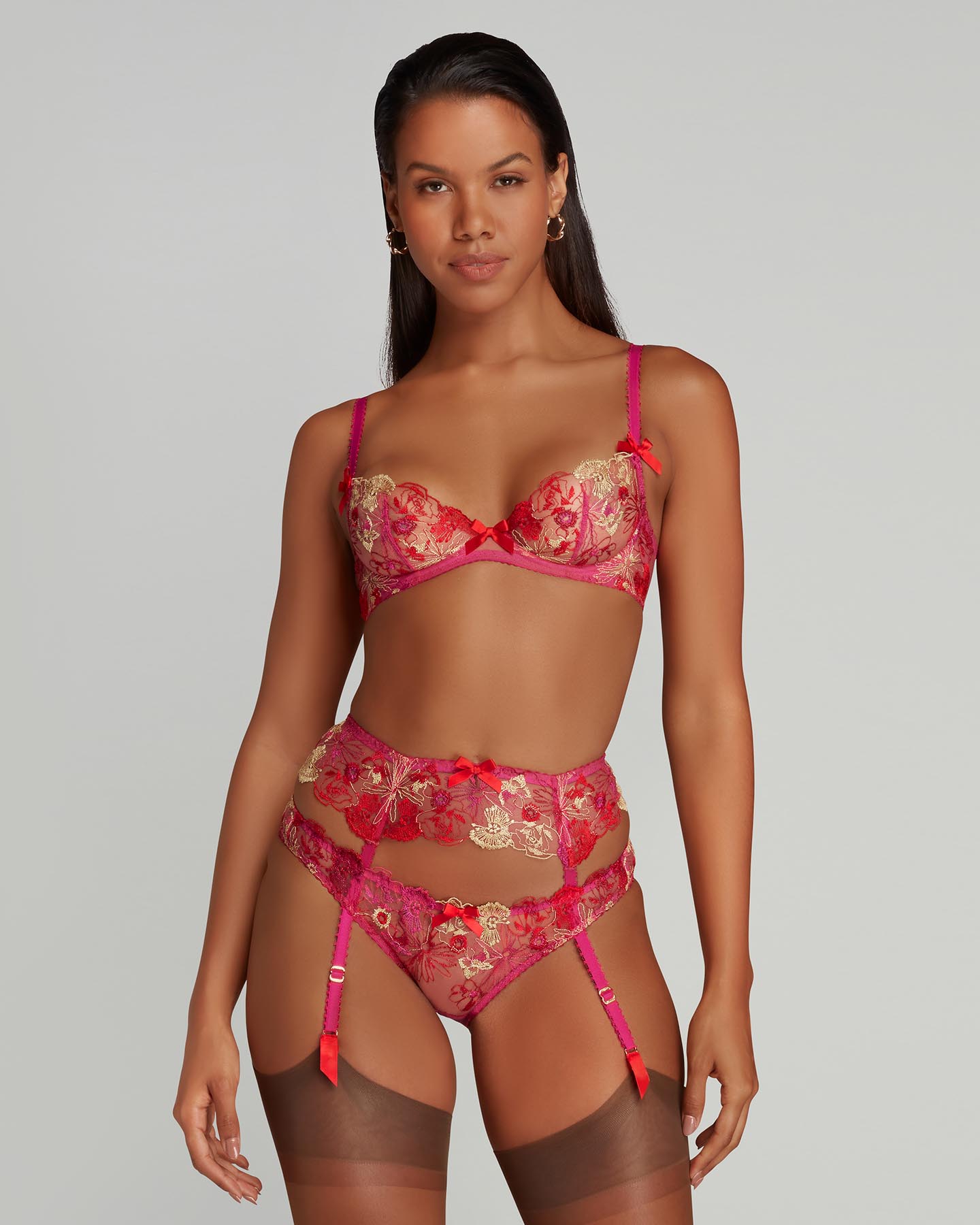 Прозрачный пояс для чулок цвета фуксия из коллекции Zuri выполнен из легкого тюля. Передняя и боковые панели декорированы цветочной французской вышивкой золотого, розового и красного цветов. Эластичные бретели регулируются 24-х каратными позолоченными ползунками. По центру пояса располагается красный атласный бантик. Создайте образ девушки мечты в полном комплекте Zuri.