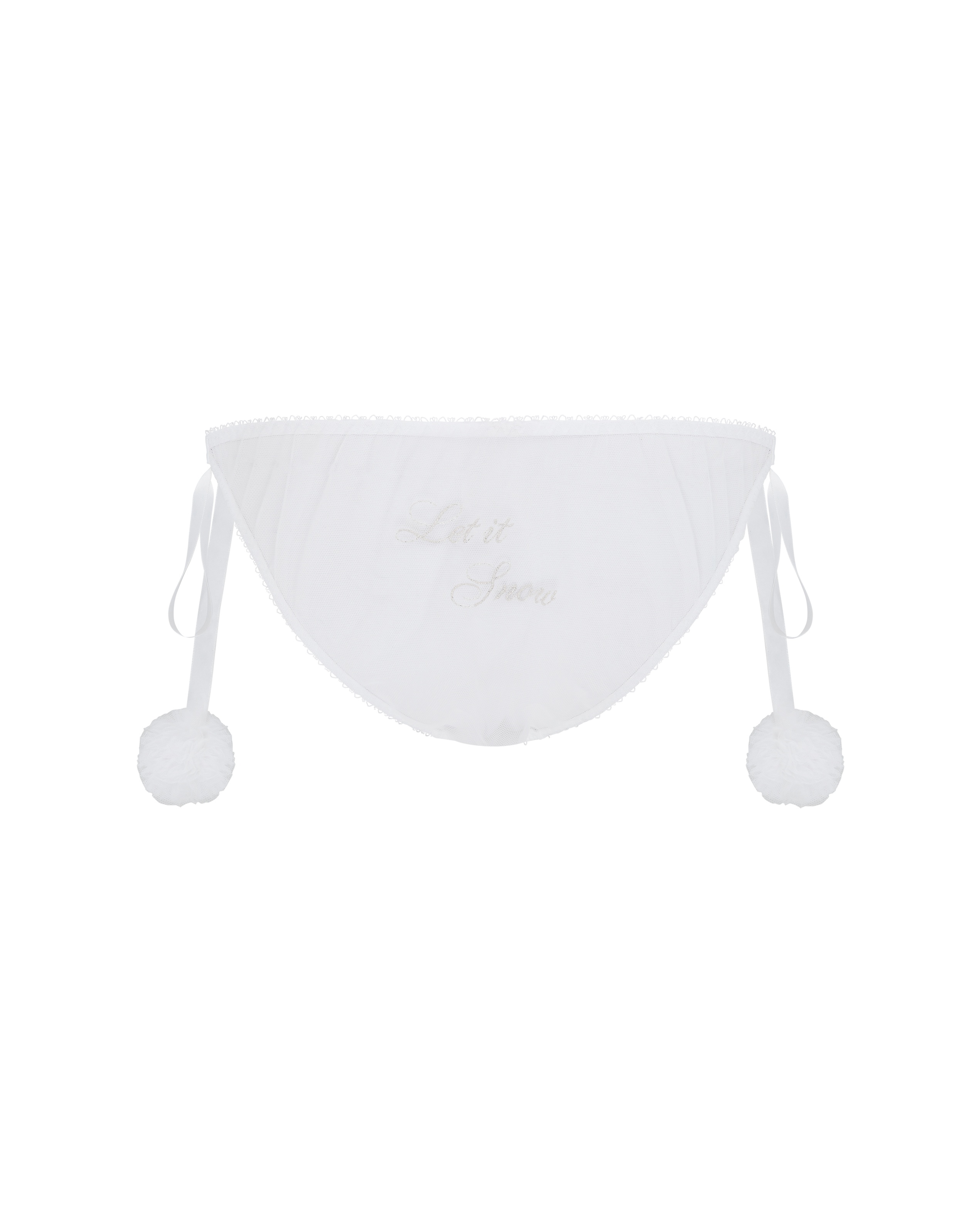 Трусики бриф на завязках Frostine пошиты из прозрачного сетчатого тюля цвета слоновой кости. Классическая модель украшена вышивкой "Let It Snow" на задней панели. Атласные боковые ленты оканчиваются пушистыми помпонами.