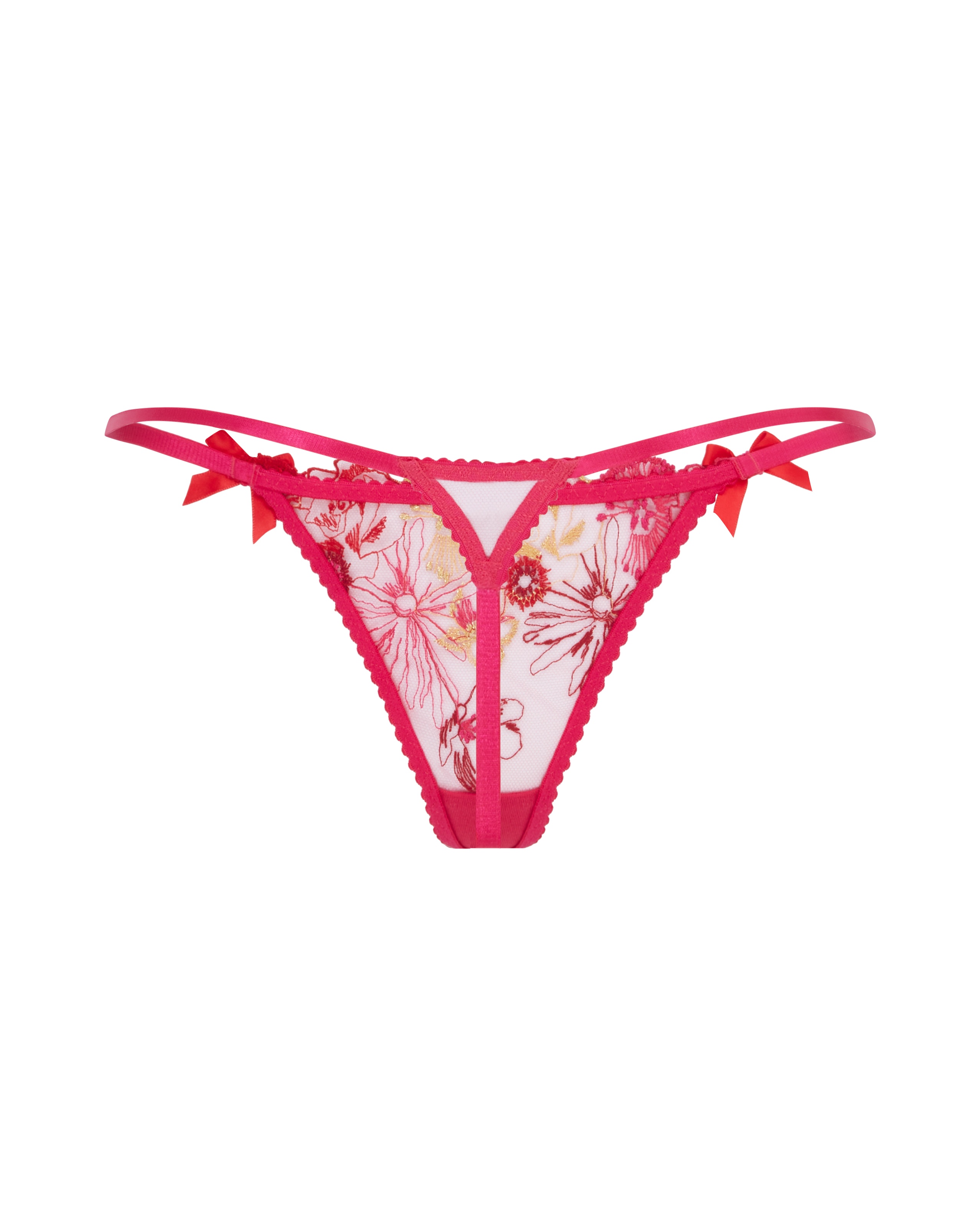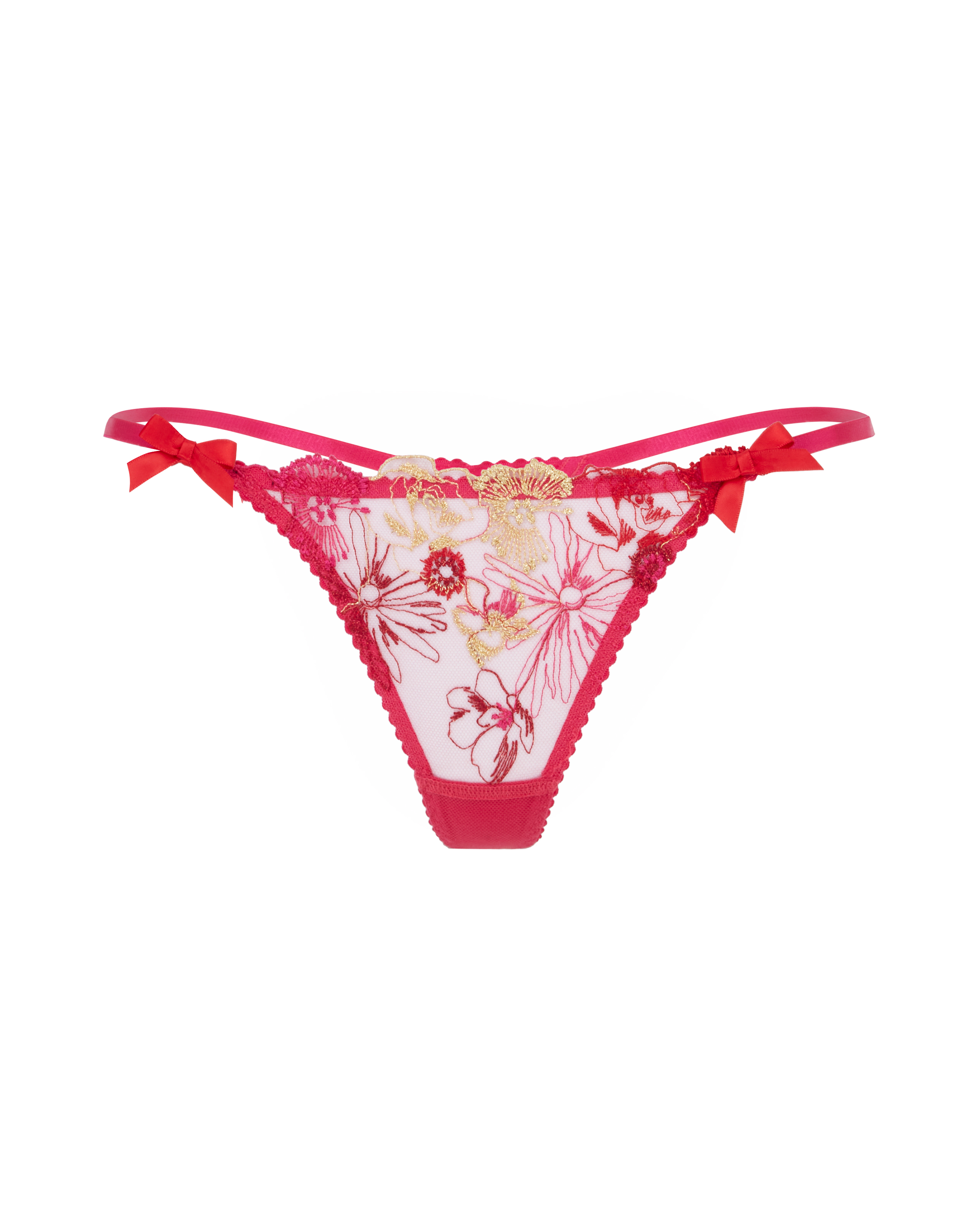 Трусики стринг цвета фуксии из коллекции Zuri пошиты из легкого прозрачного тюля. Спереди модель украшена изысканной французской вышивкой в виде красных, золотых и розовых цветов. На поясе по бокам передней панели расположились красные атласные бантики. Сочетайте с бюстгальтером и поясом для чулок из этой же коллекции для завершения образа девушки мечты.