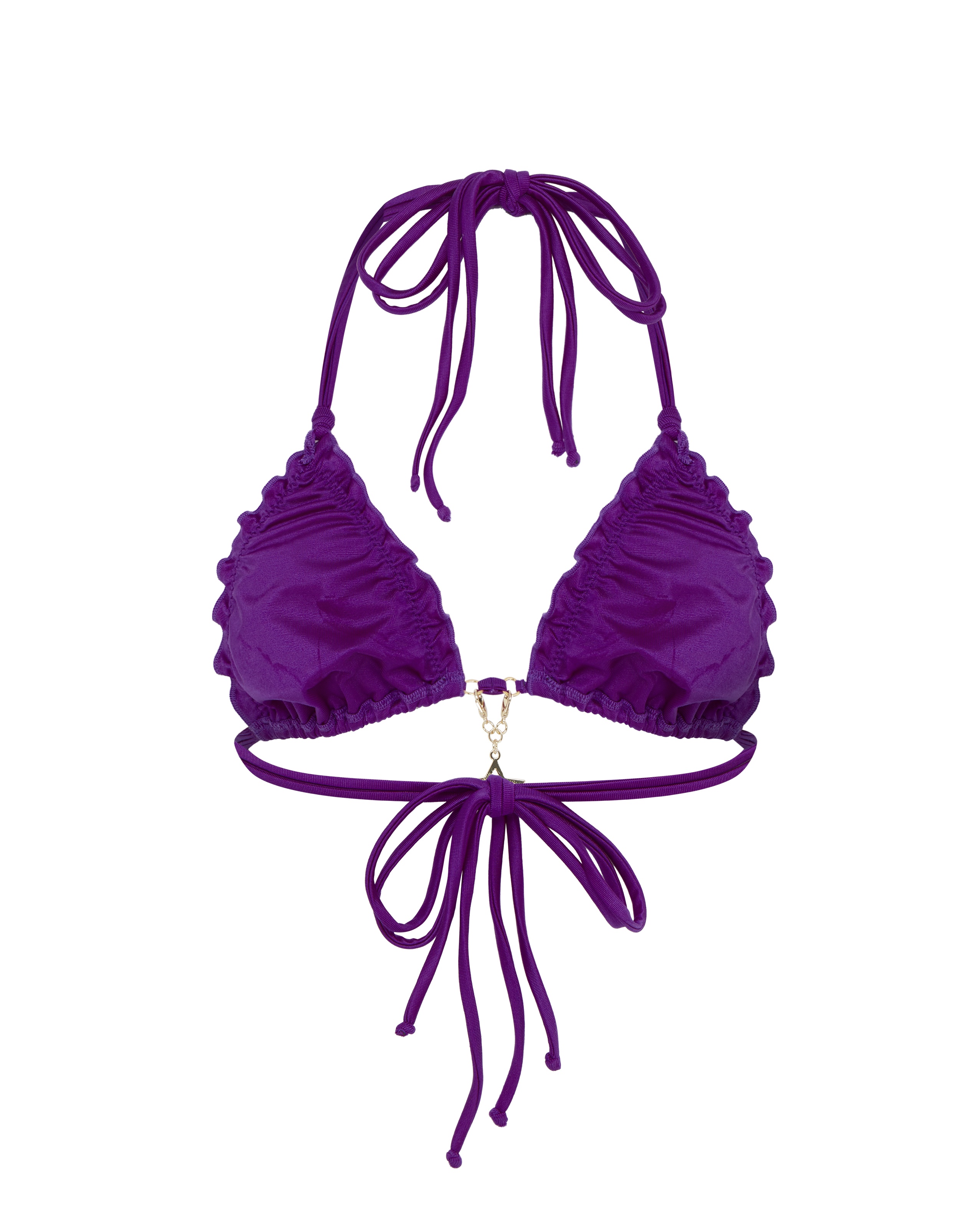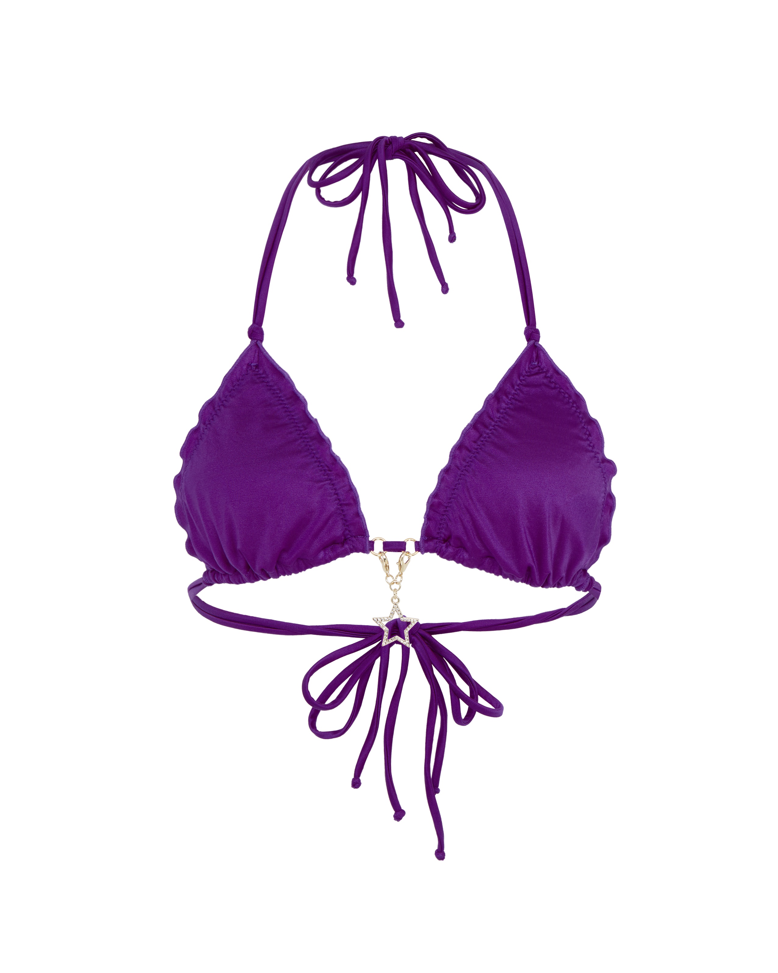 Топ купальника Berry пурпурного цвета на бретелях-халтер. Треугольные чашки с регулируемой сборкой. Итальянская купальная ткань, оборчатые края. Между чашками свисает подвеска в виде звезды с кристаллами и водостойким покрытием. Сочетайте с плавками Berry для ослепительного образа.