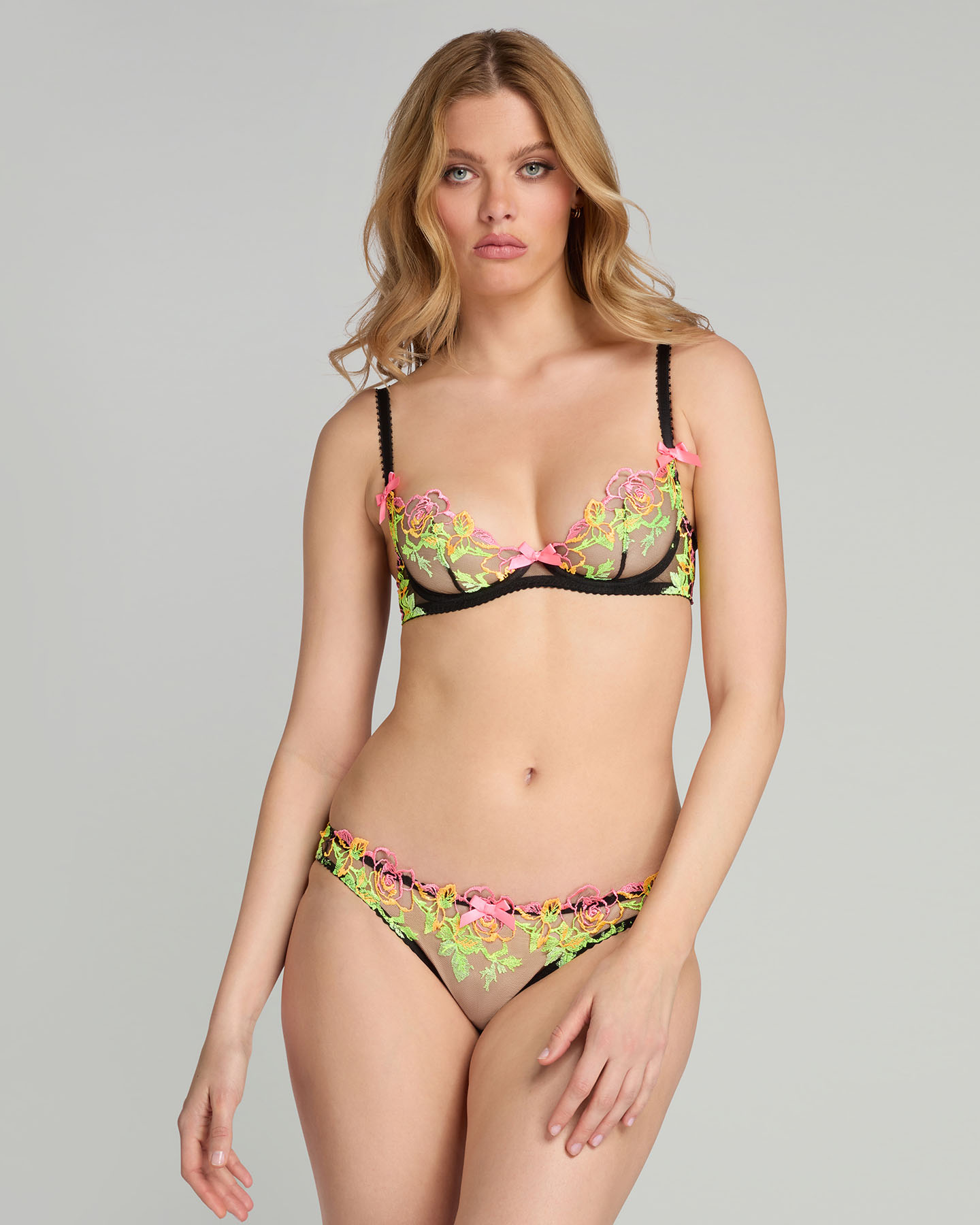 В бюстгальтере Callypso классическая форма дополнена яркой неоновой вышивкой на черном фоне. Основа выполнена из итальянского тюля, а бретели украшены милой каймой. Золотая фурнитура придает изделию особую роскошь. Создайте неповторимый комплект, объединив его с другими элементами серии Callypso.