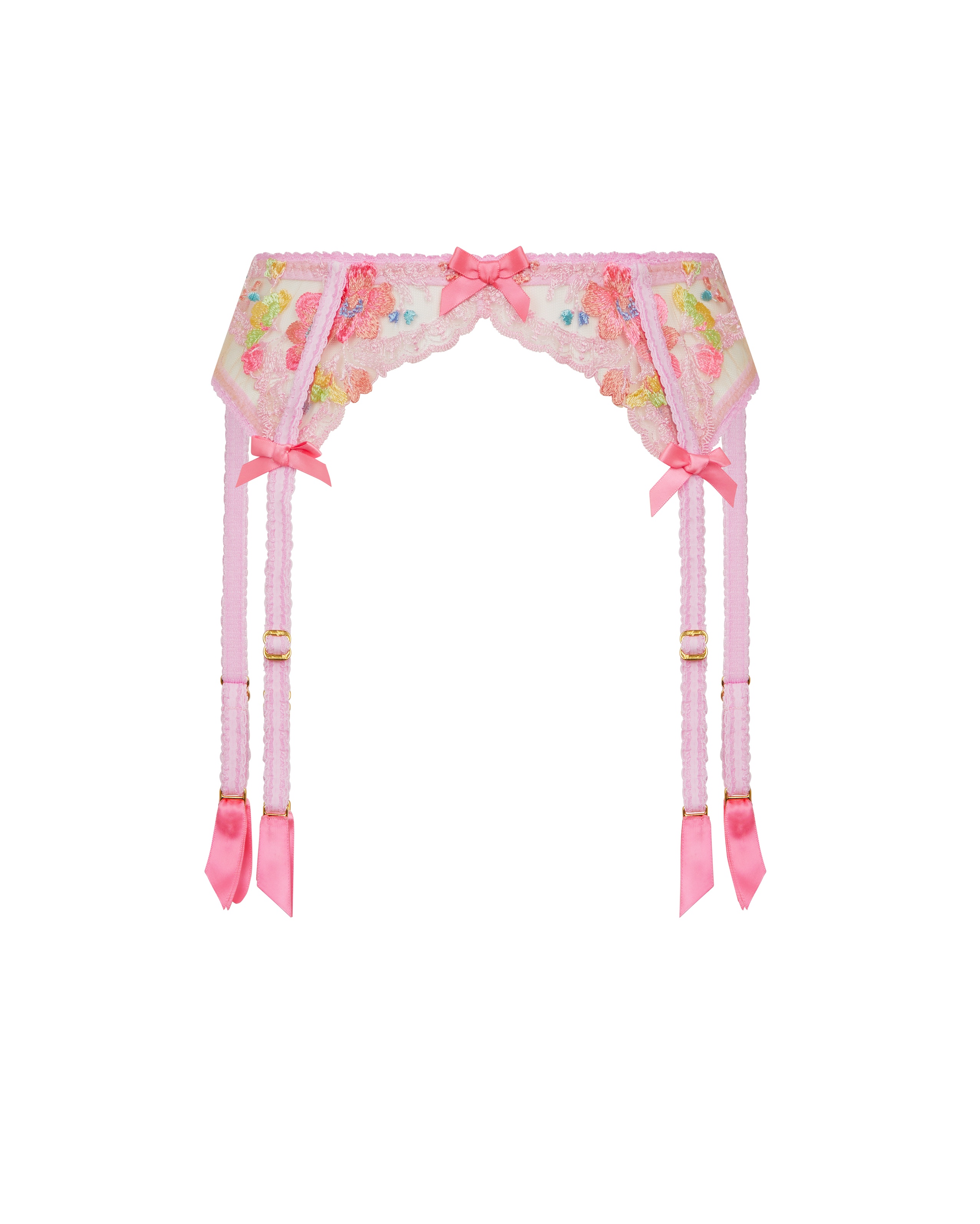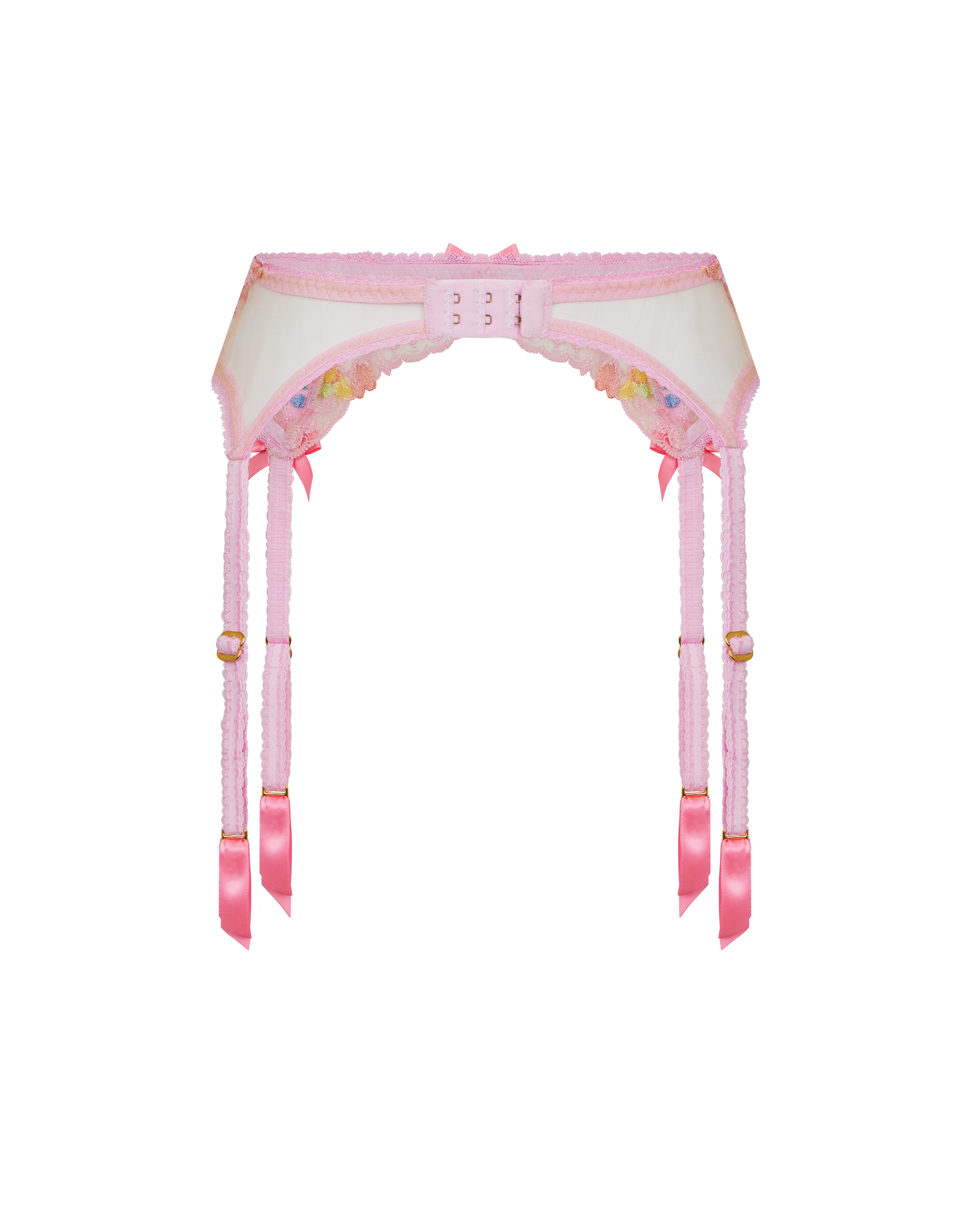 Пояс для чулок Rixie розового цвета выполнен на основе прозрачного тюля и украшен цветочной швейцарской вышивкой. Ажурный зубчатый край и позолоченная фурнитура. Дополните свой образ другими предметами комплекта Rixie.
