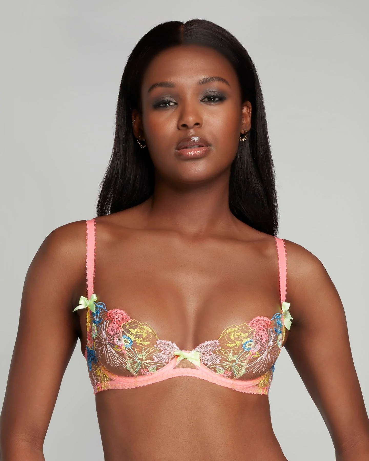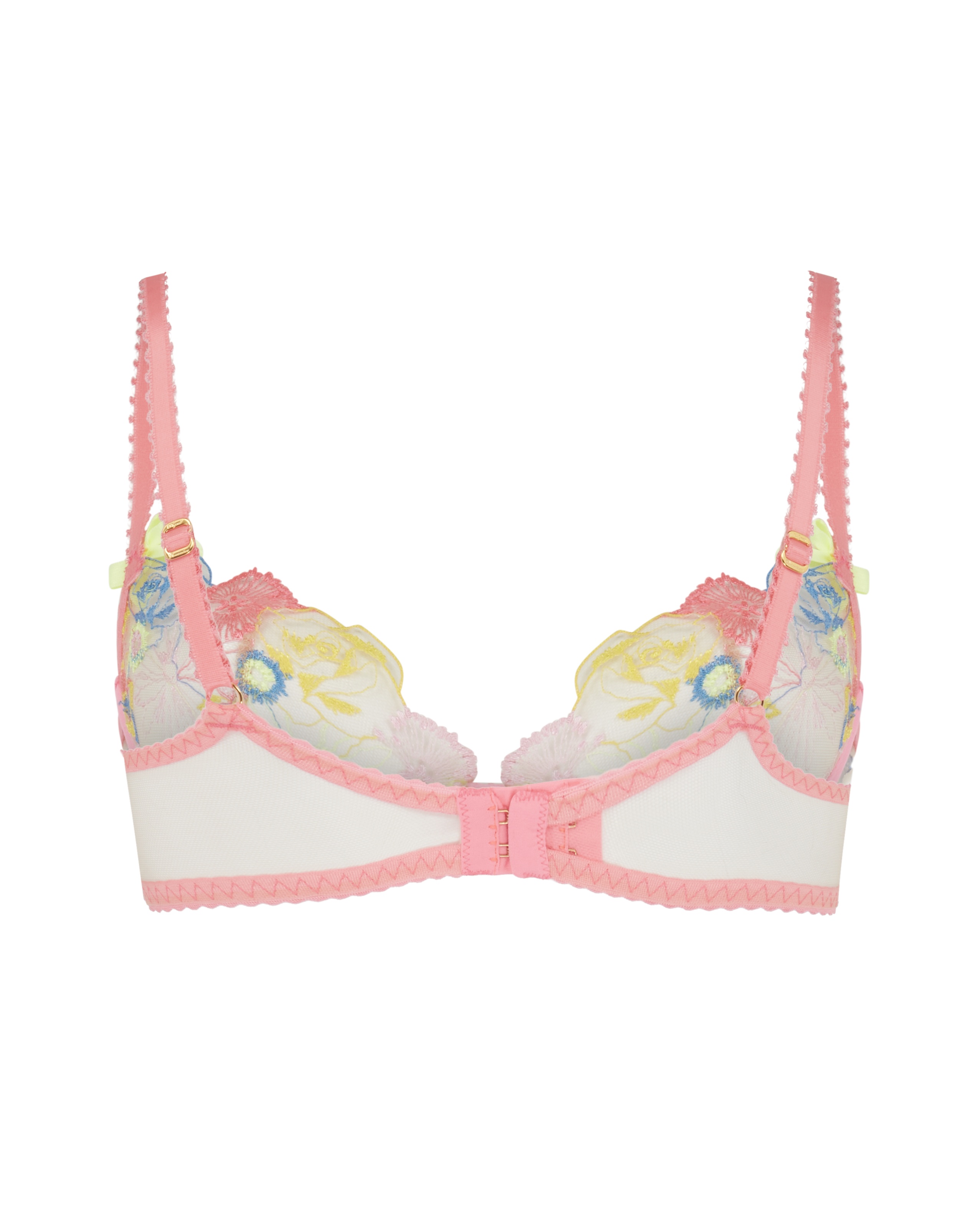 Бюстгальтер Zuri выполнен из полупрозрачного тюля песочного цвета. Мягкая модель без подкладки с глубоким вырезом декорирована разноцветной австрийской вышивкой с цветочным мотивом. Усиленная поддержка объемной груди достигается за счет широких бретелей, оснащенных фестончатыми срезами.