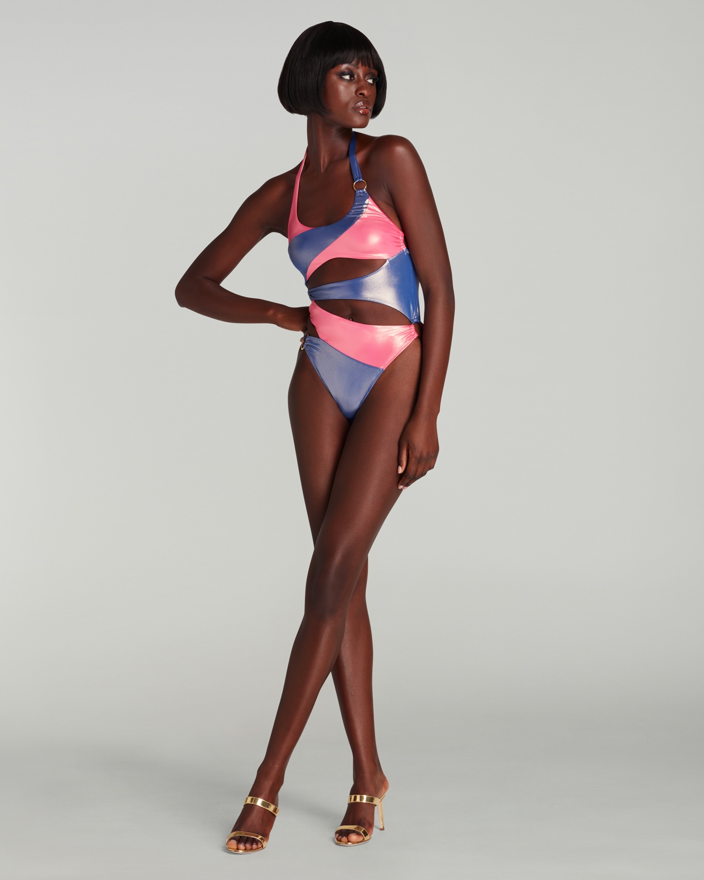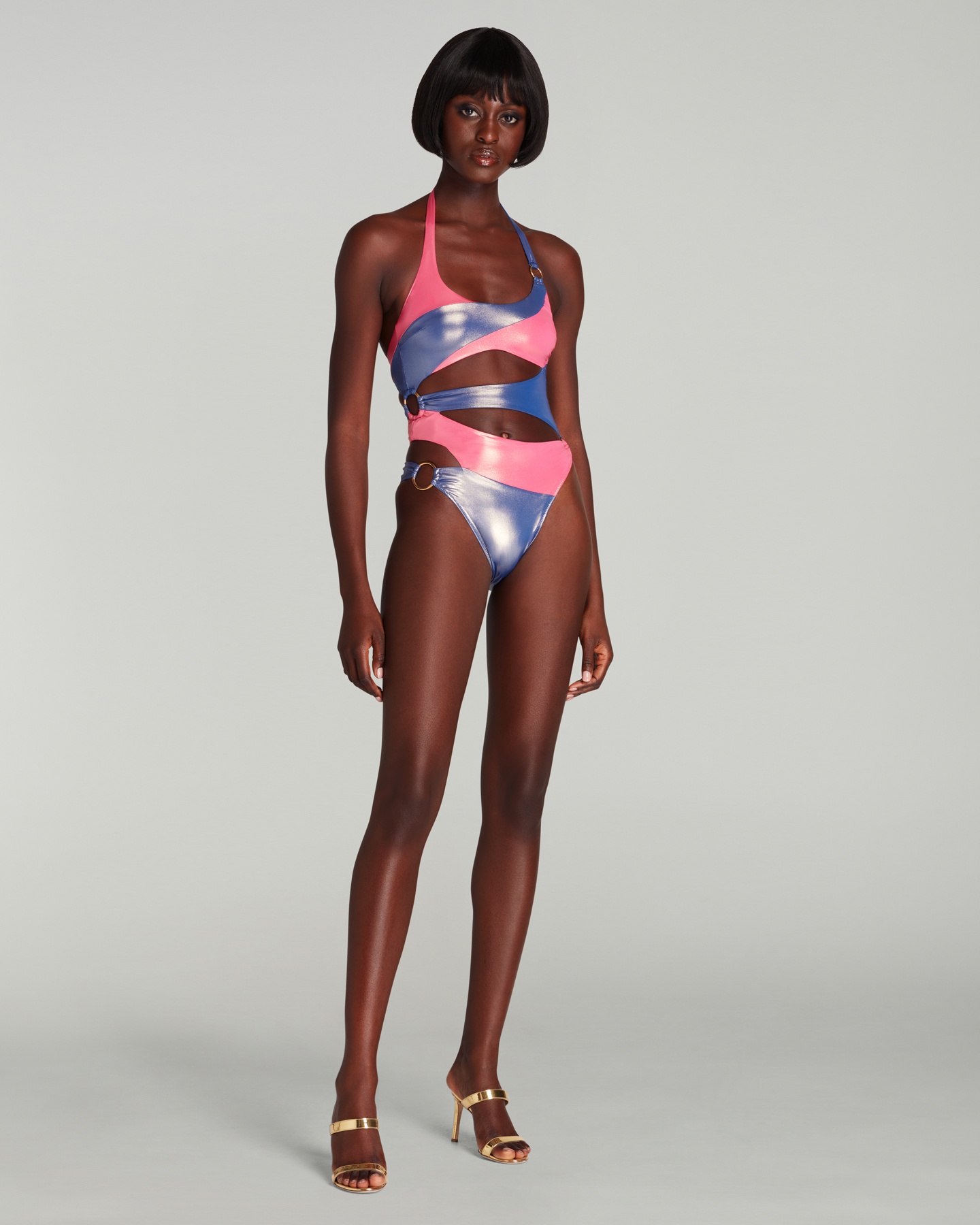 Купальник Jayla в розово-голубой расцветке с асимметричными вырезами и массивными кольцами. Застежка на шее с золотым покрытием и водостойкая фурнитура идеально подойдут для солнечных дней и отдыха у воды.