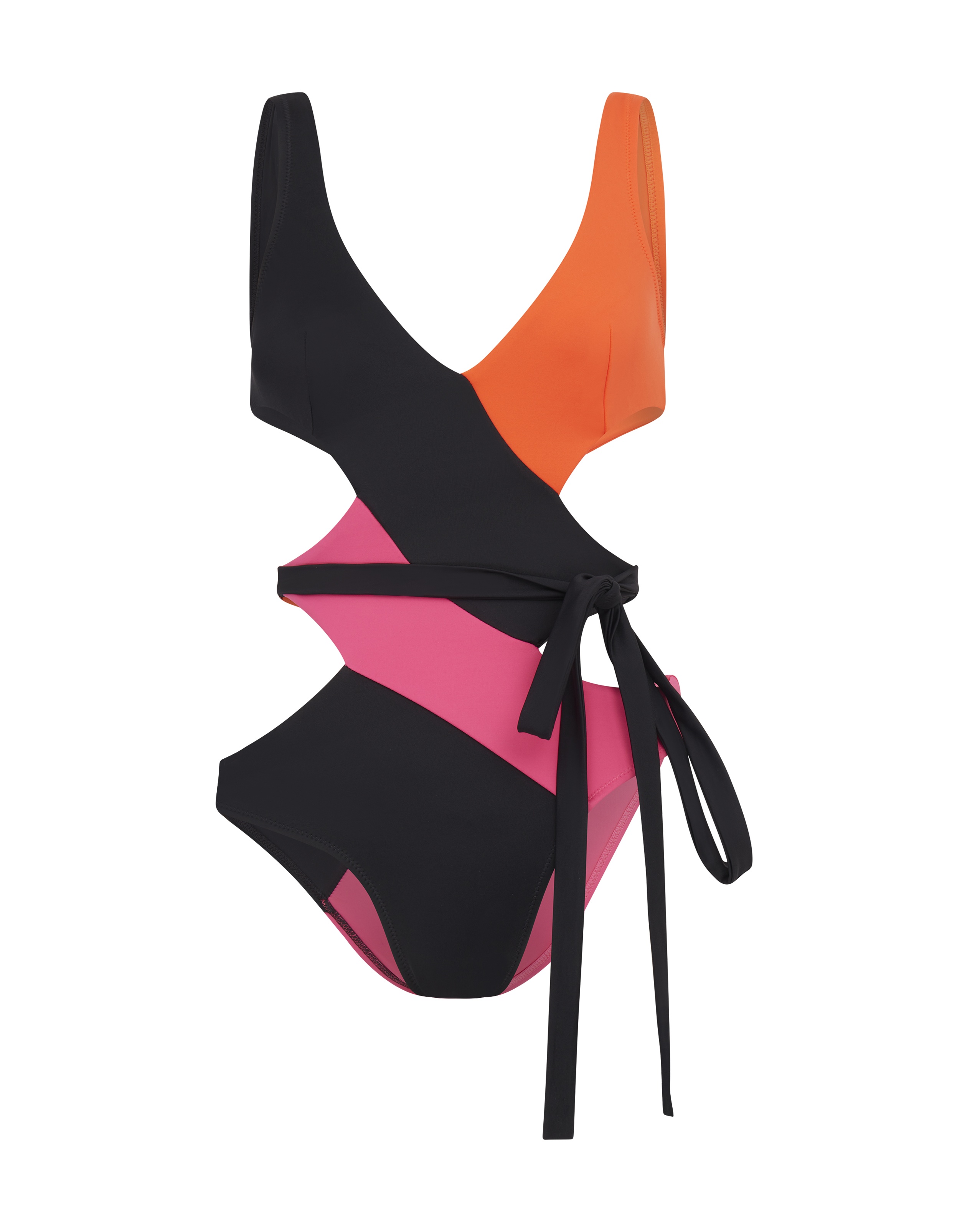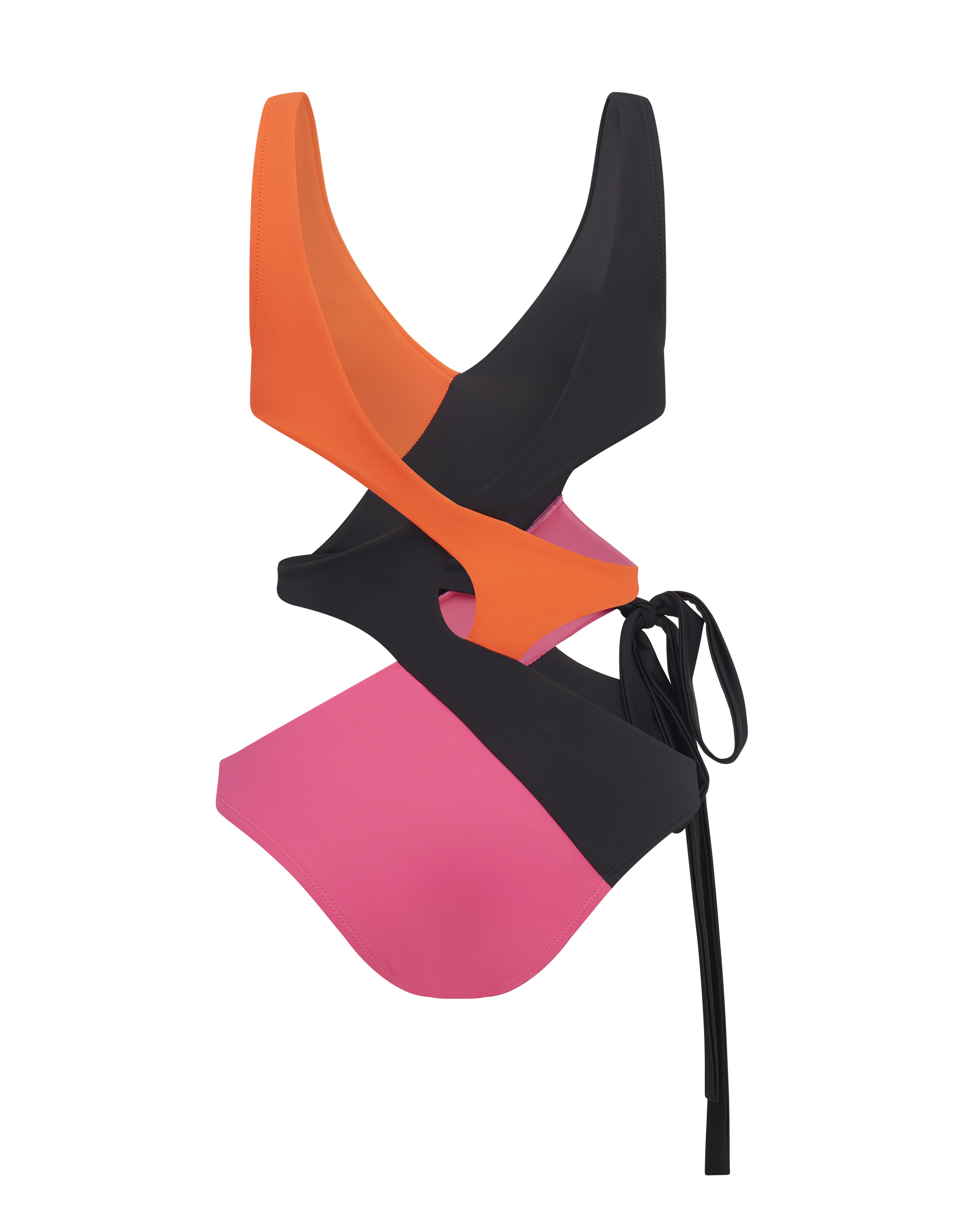 Сияющая Racy возвращается в новом ярком цветовом решении. Черный купальник с розовыми и оранжевыми акцентами, выполнен из итальянской технологичной устойчивой ткани. Откровенные вырезы придают образу пикантности.