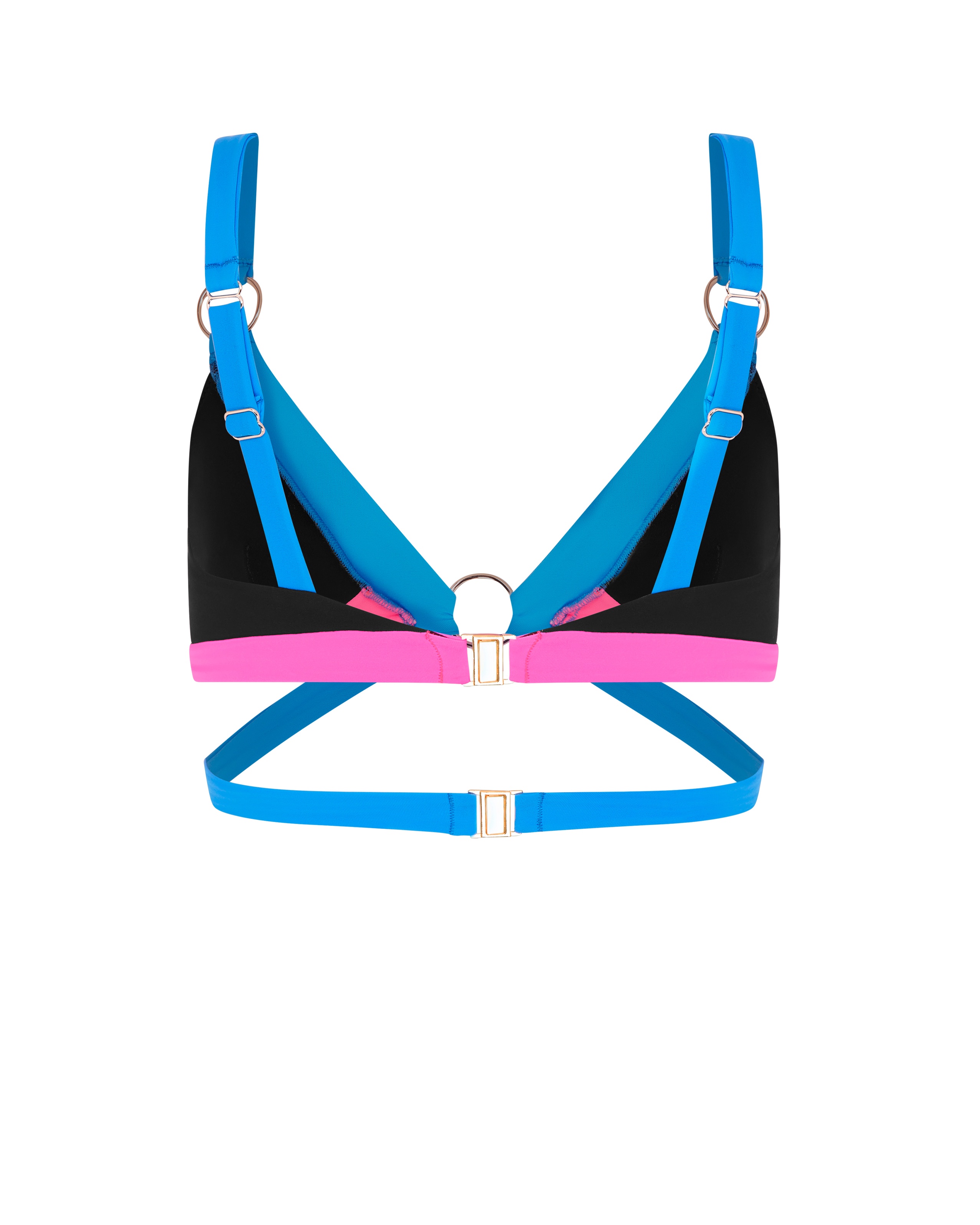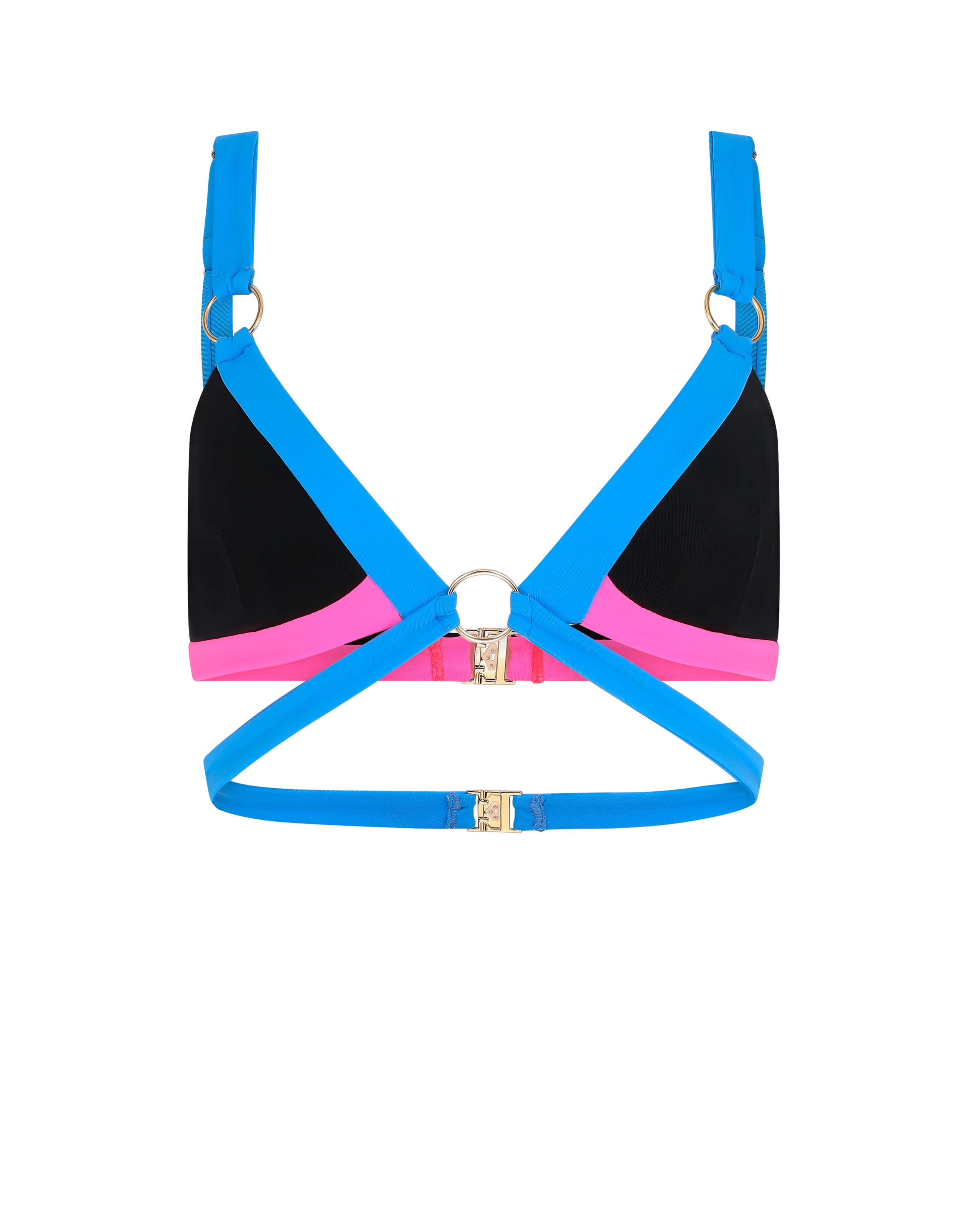 Топ Imizia с мягкими треугольными чашками в черно-розово-голубой гамме дополнен массивными золотистыми кольцами. Итальянская ткань и термостойкая фурнитура гарантируют идеальную посадку и комфорт. Носите его с плавками из этой же коллекции.