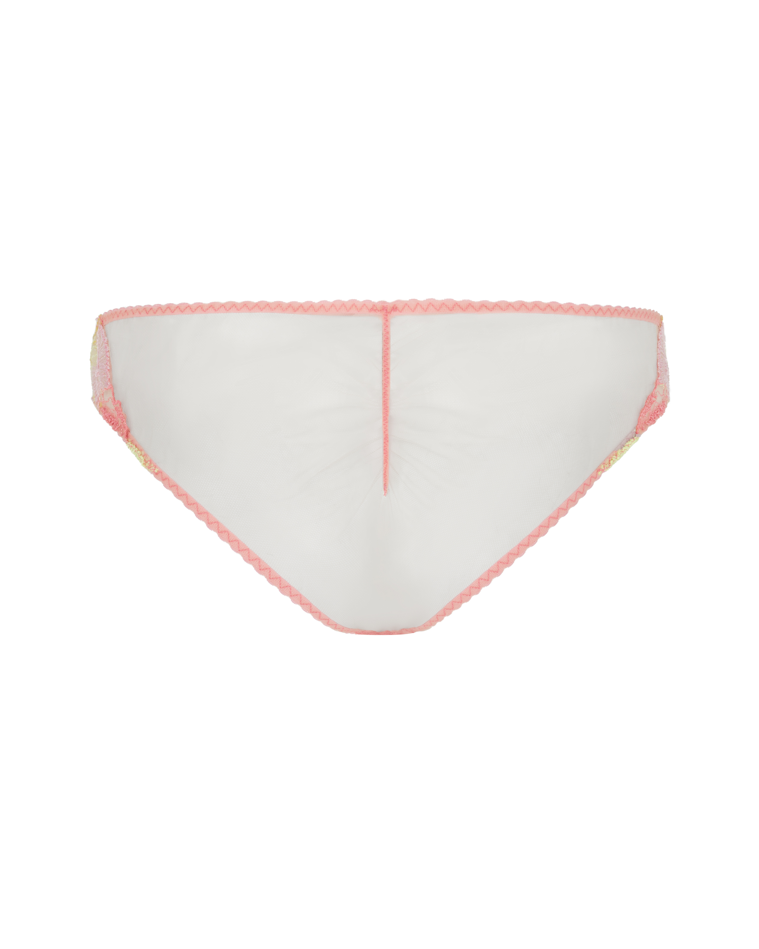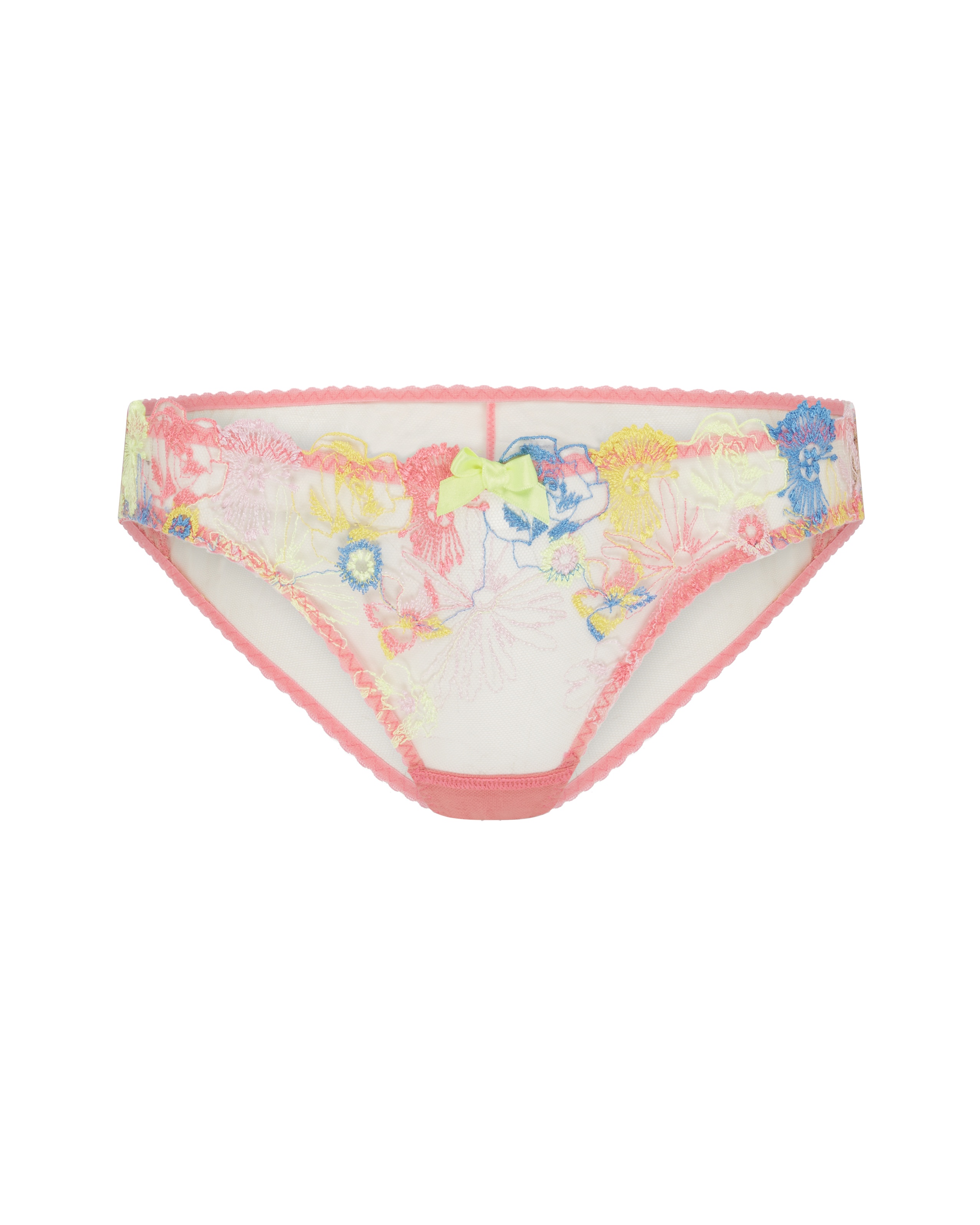 Классические брифы из коллекции Zuri выполнены из светлого полупрозрачного тюля с розовой атласной отделкой. Спереди и сбоку на основу нанесена разноцветными нитями австрийская цветочная вышивка. Середину пояса венчает атласный бантик. Средний шов на задней панели формирует и подчеркивает формы.