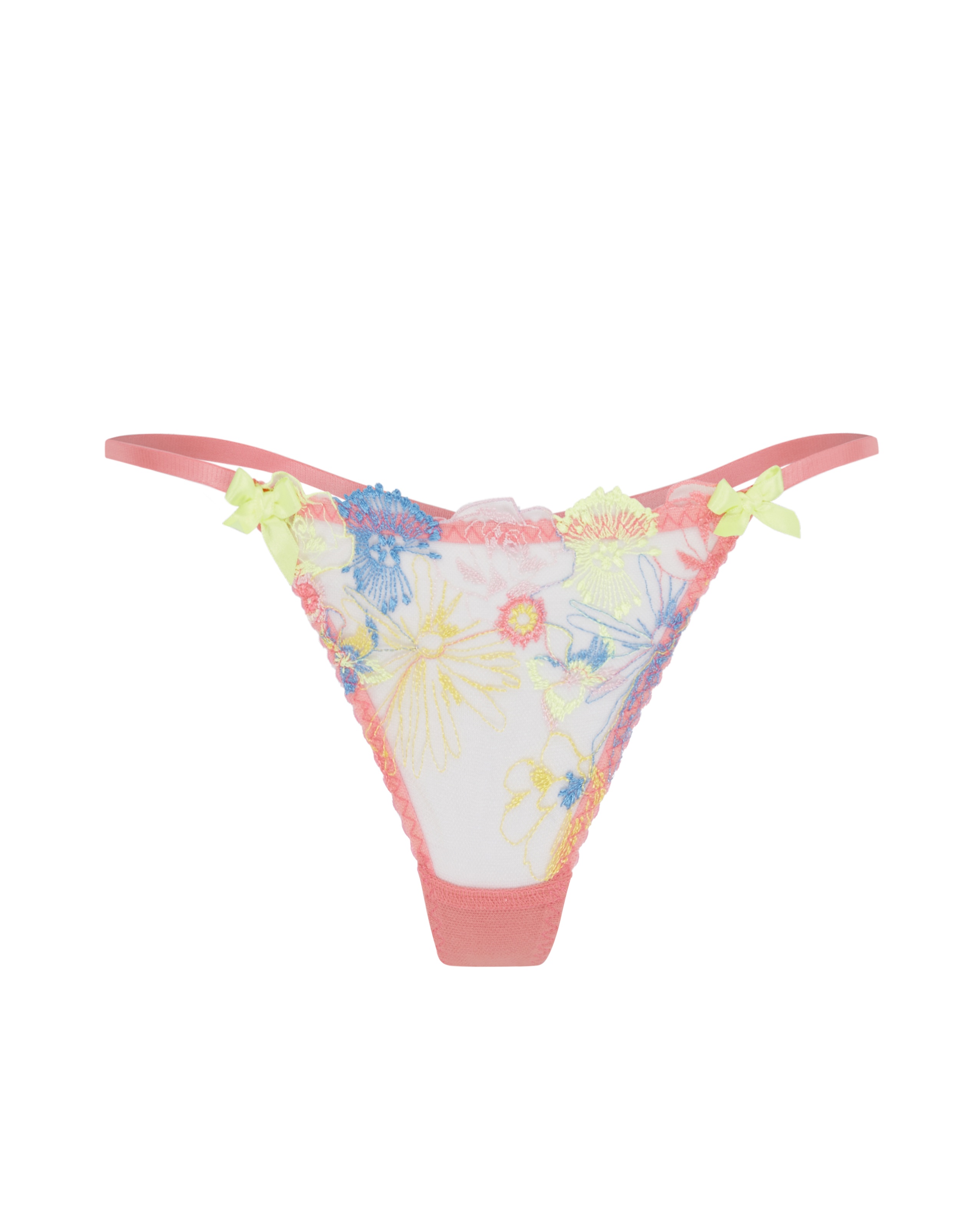 При создании трусиков стринг из коллекции Zuri основой был выбран полупрозрачный тюль. Поверх него нанесена разноцветная вышивка с цветочным мотивом, разработанная в Австрии. Боковые части пояса украшают атласные бантики. Розовые эластичные ленты встречаются сзади в классическом треугольнике.