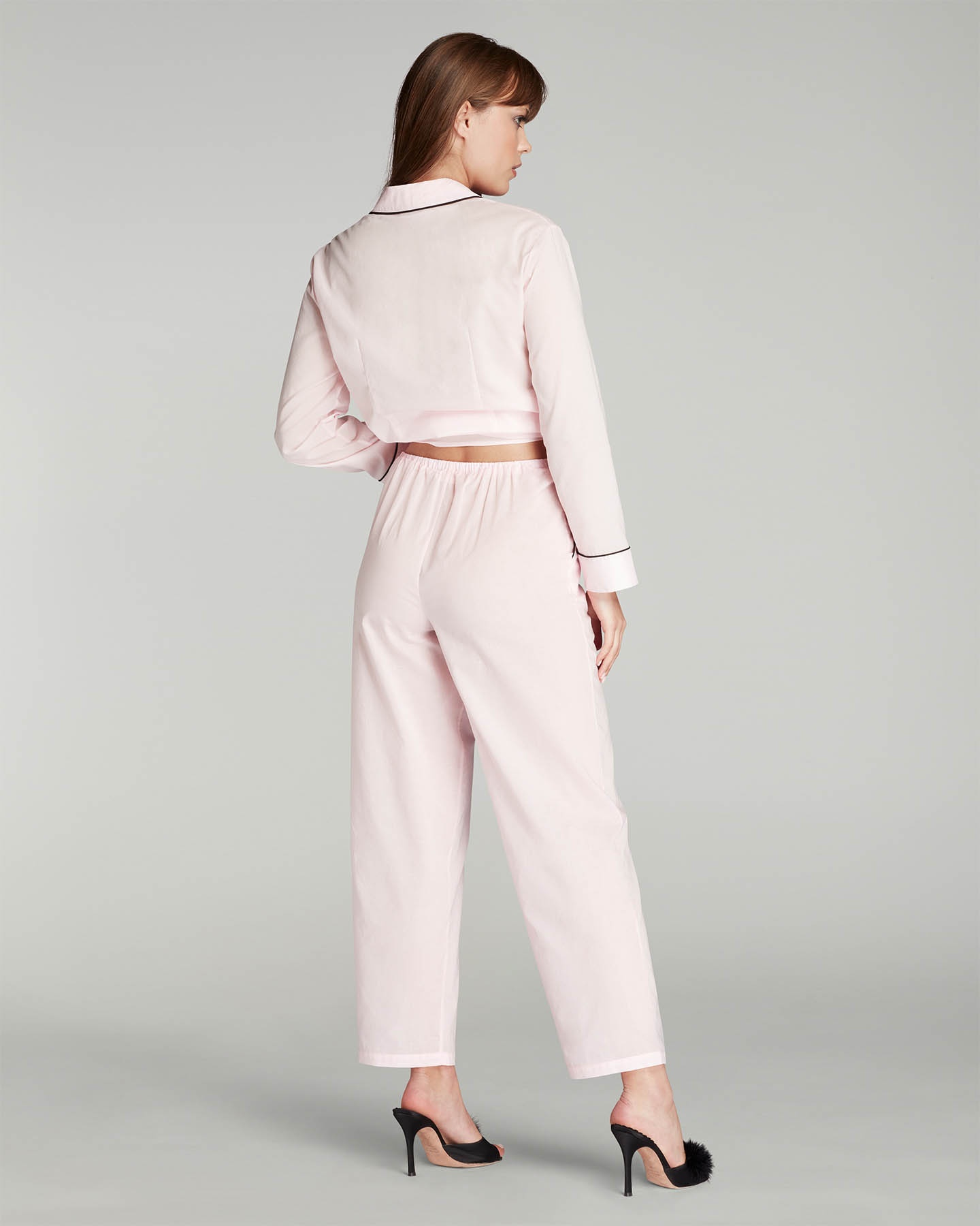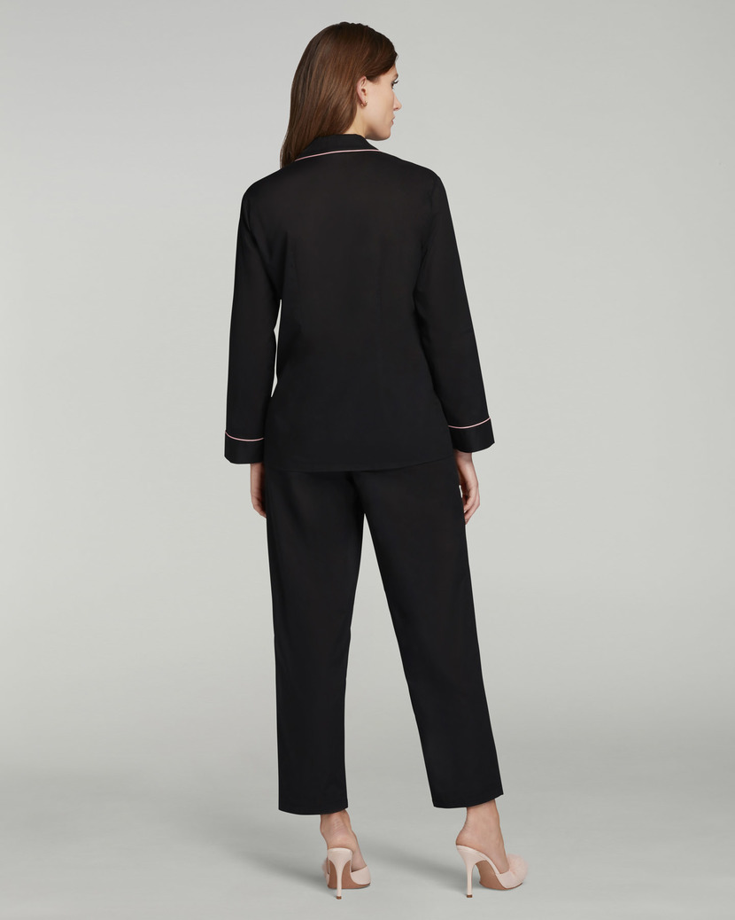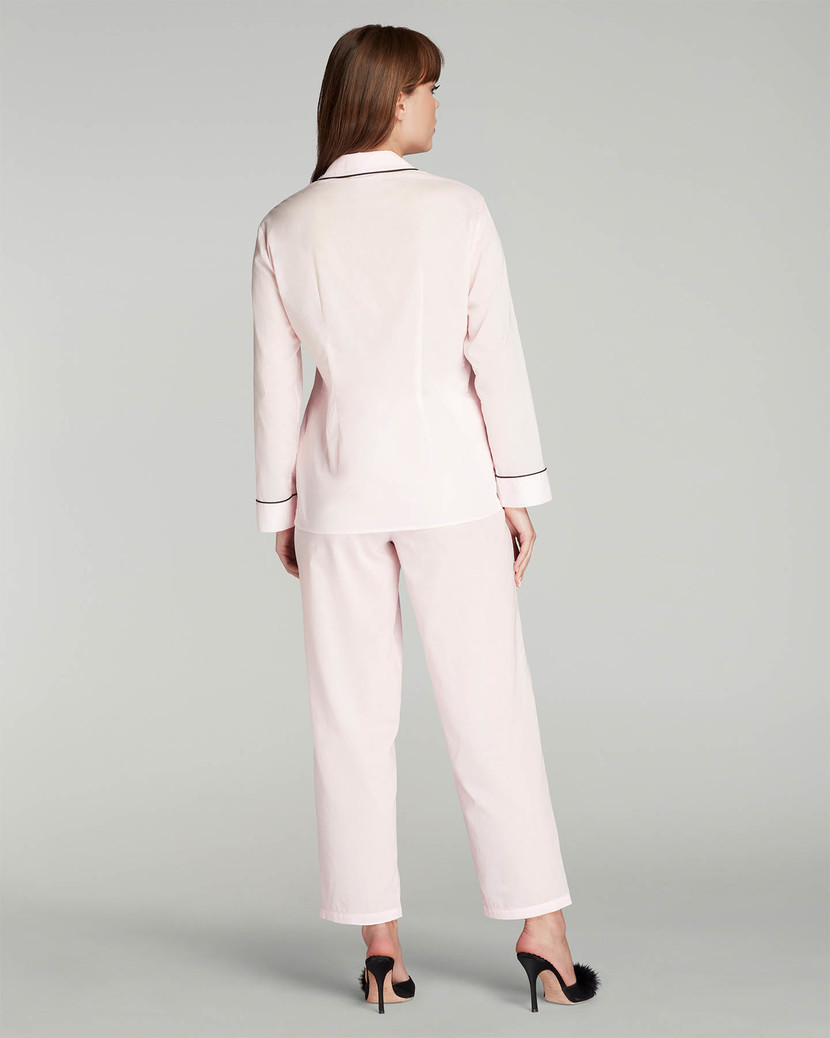 Пижама нежно-розового цвета Filipa выполнена из легкой хлопчатобумажной ткани, хорошо пропускающей воздух. Вдохновленный винтажным стилем комплект состоит из прямых рубашки и брюк с карманами. Модель декорирована контрастным черным кантом.