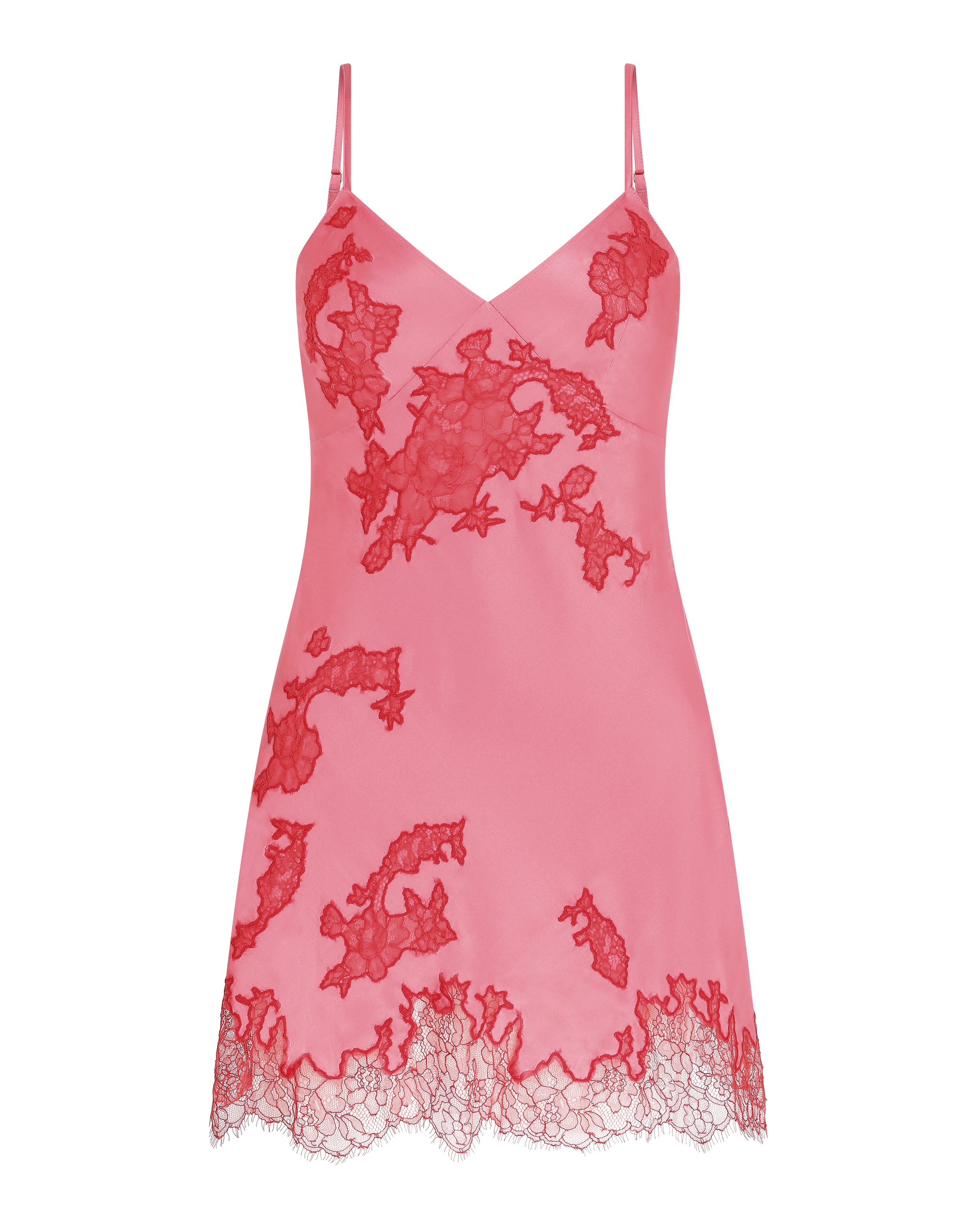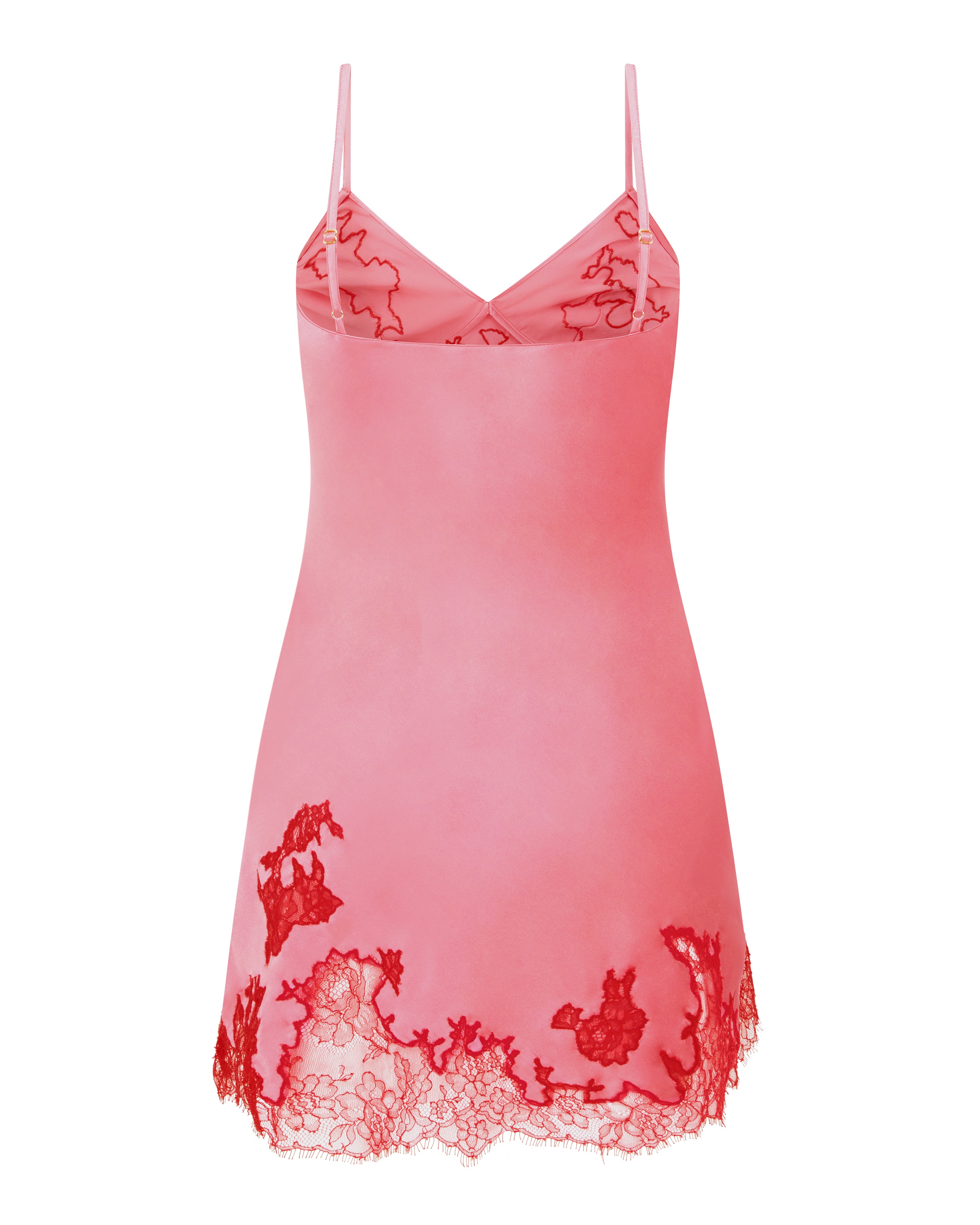 Розовая шелковая сорочка из коллекции Christi с красным кружевом мягко облегает фигуру благодаря покрою по косой. Атласный шелк с легкой эластичностью придаёт комфорт, а французское кружево, вышитое вручную, украшает модель. Регулируемые бретели обеспечивают идеальную посадку.