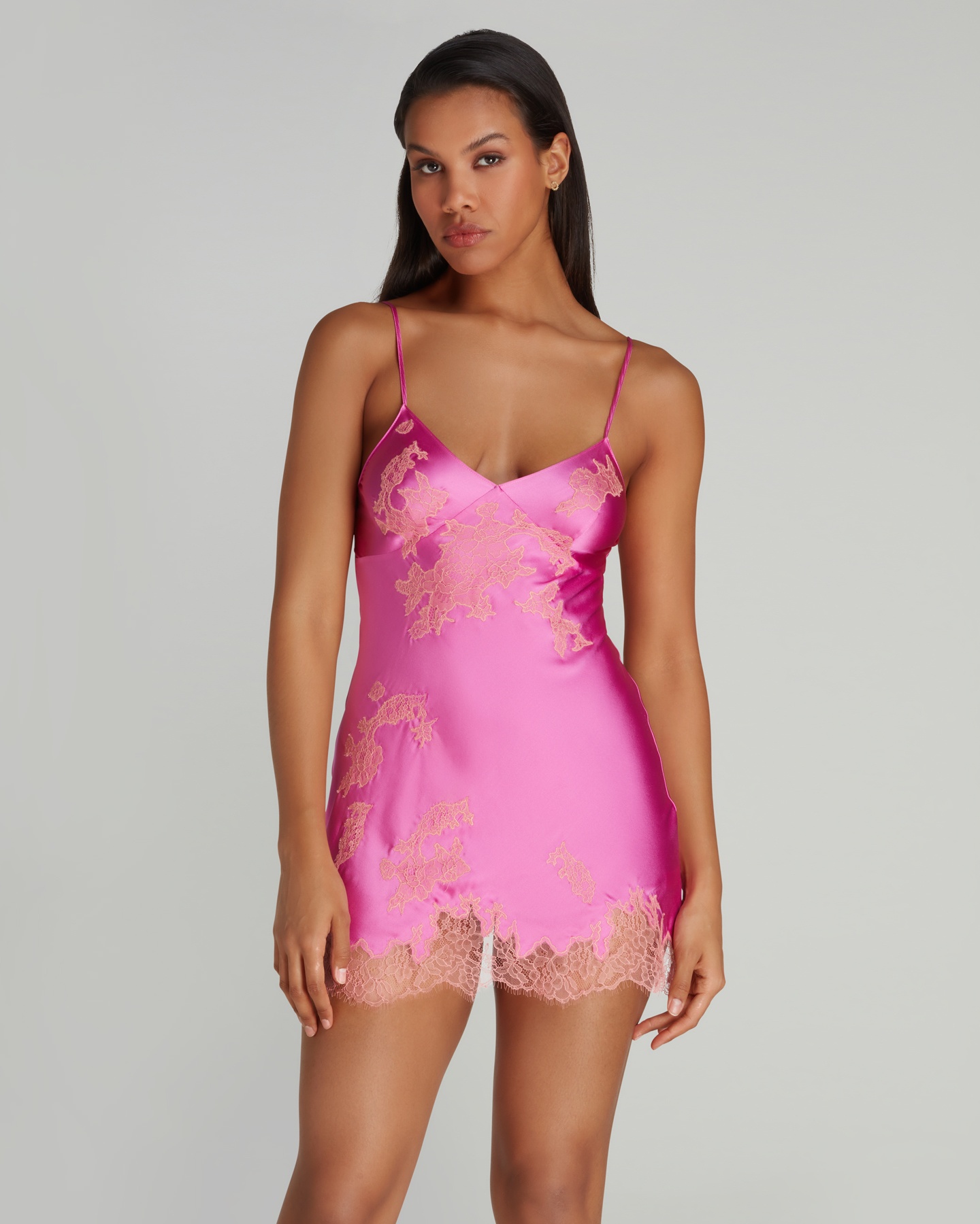 Розовая сорочка Christi с терракотовым кружевом изготовлена из шелкового сатина с добавлением эластана для большего комфорта. Украшена французским кружевом Leavers, изготовленным на севере Франции. Регулируемые бретельки позволяют идеально подогнать изделие по фигуре.