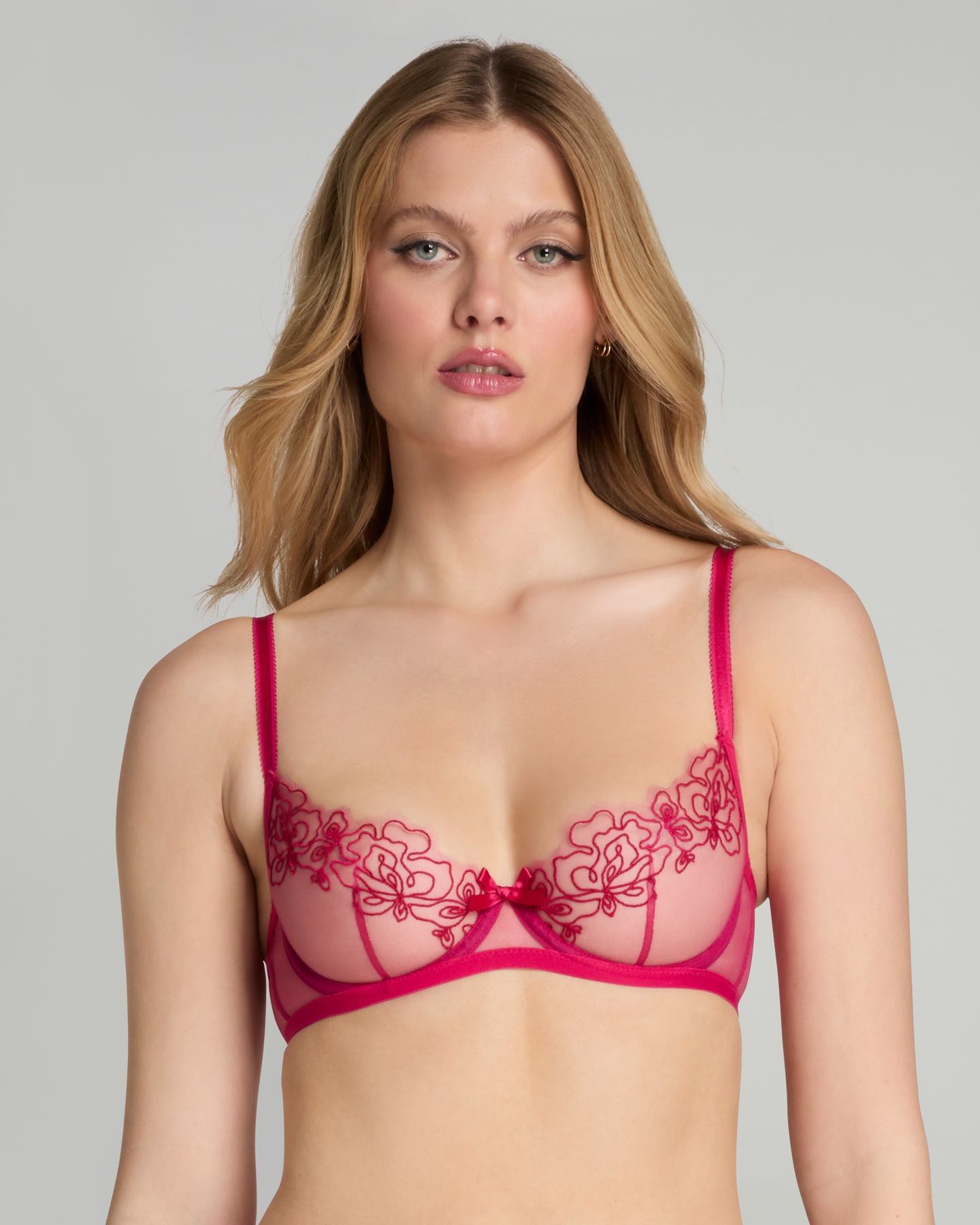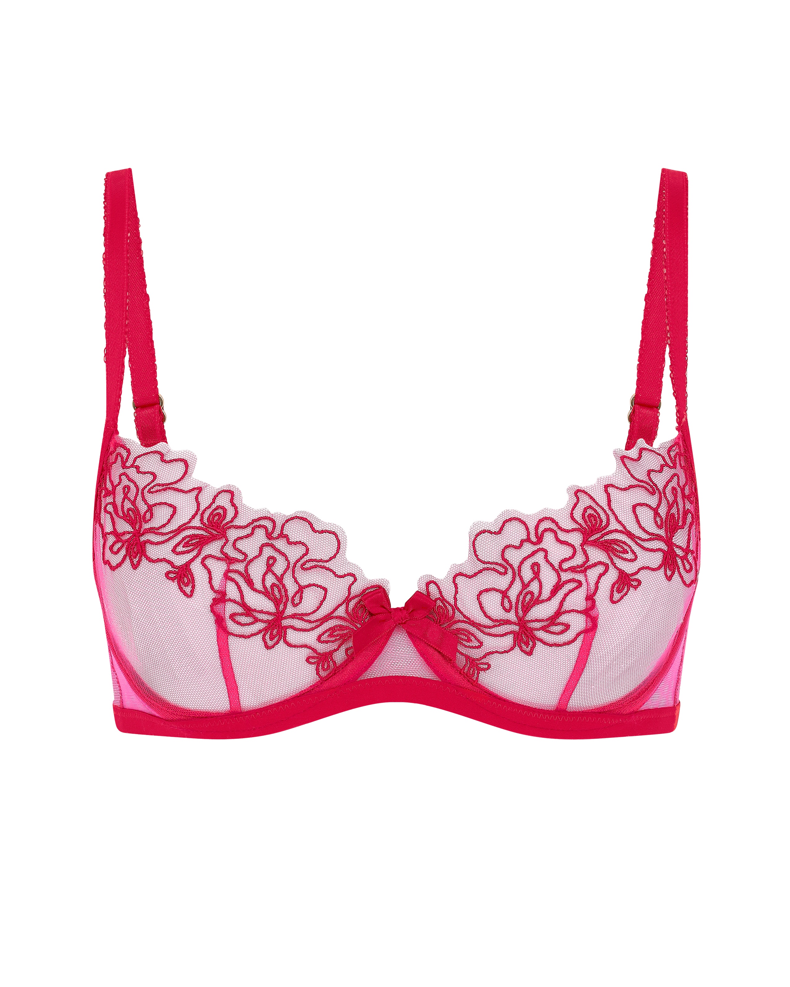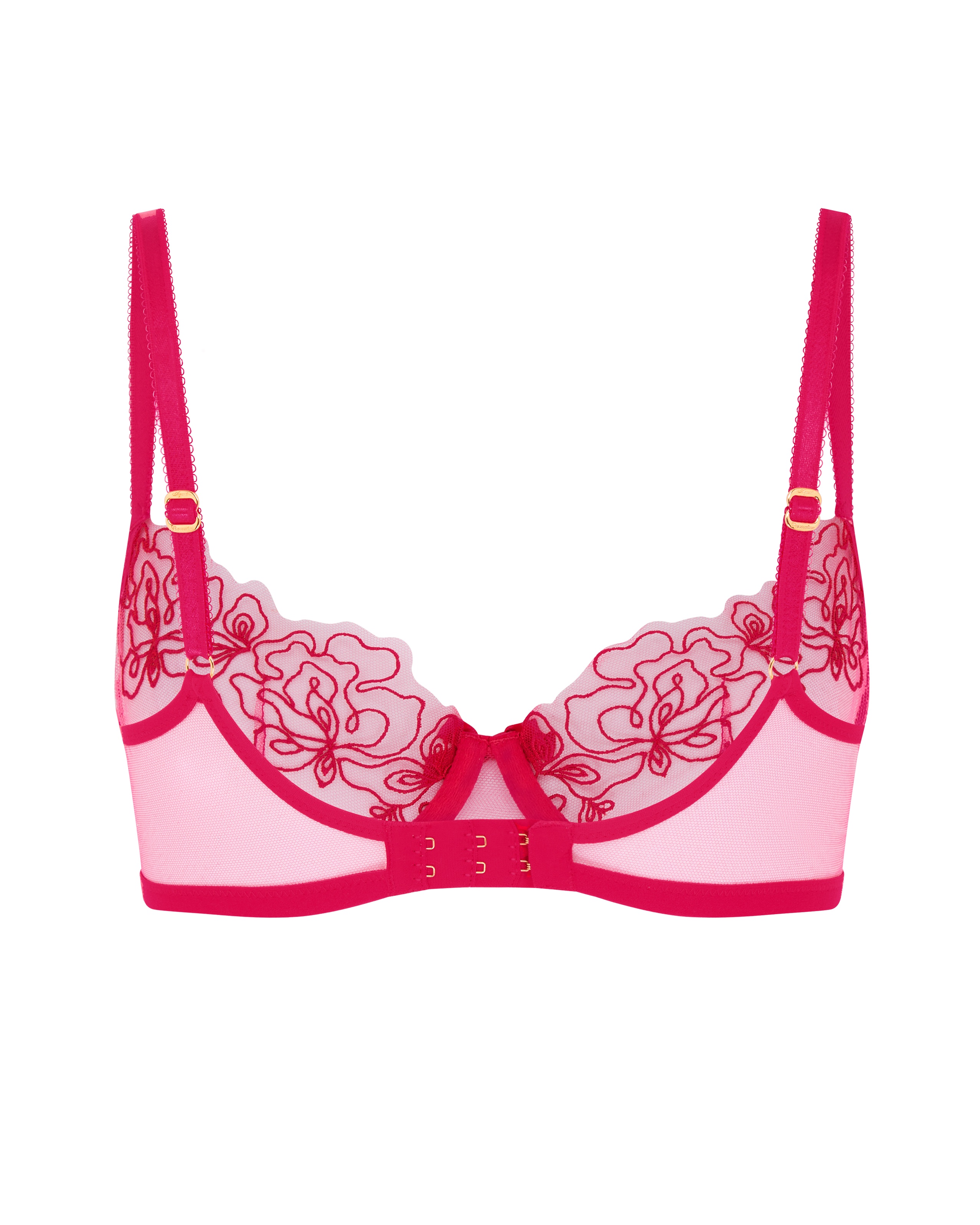 Бюстгальтер Juni с мягкими чашками выполнен из прозрачного розового тюля и украшен красной швейцарской вышивкой. Детали с покрытием из настоящего золота. Носите с остальными изделиями коллекции для идеального образа.