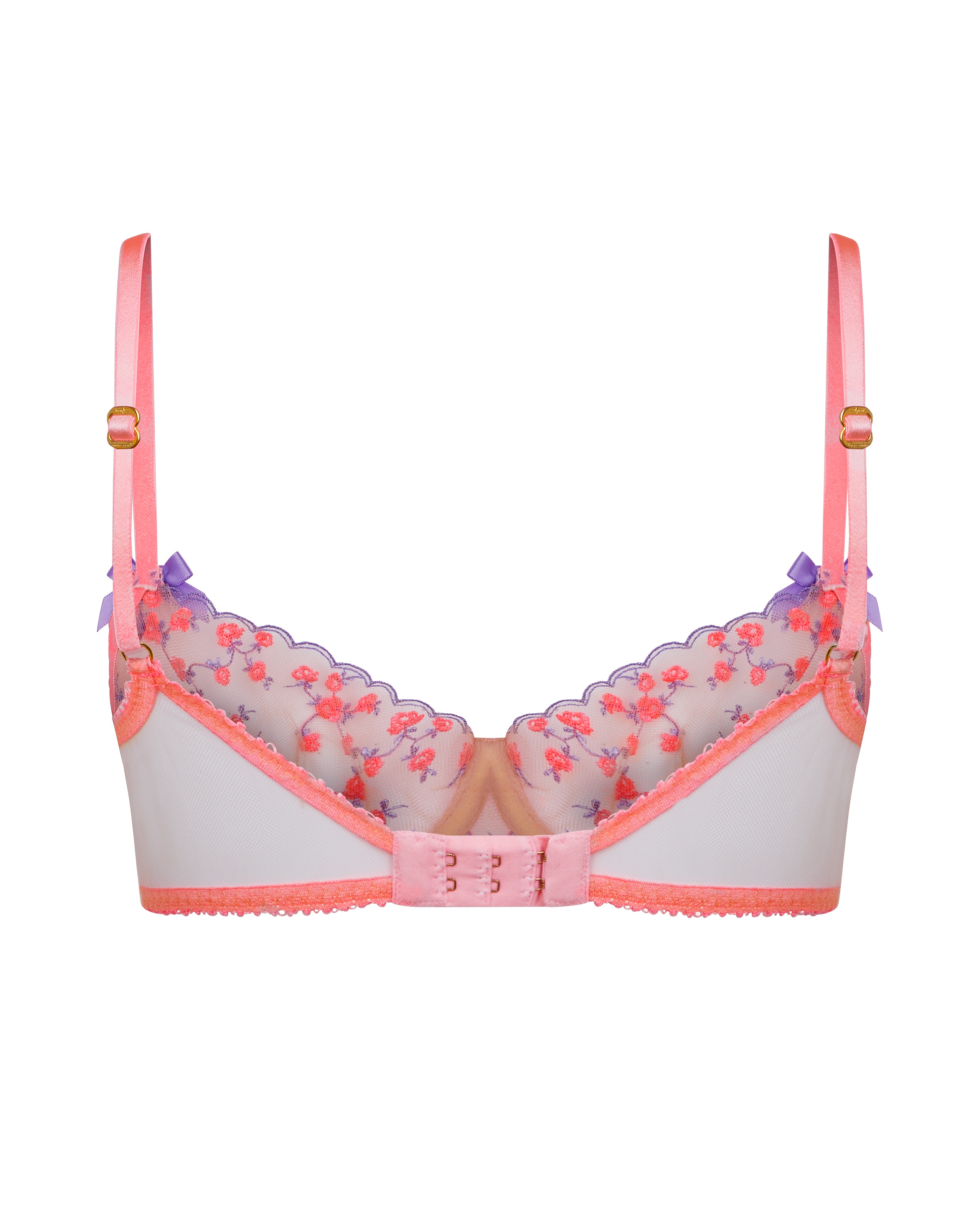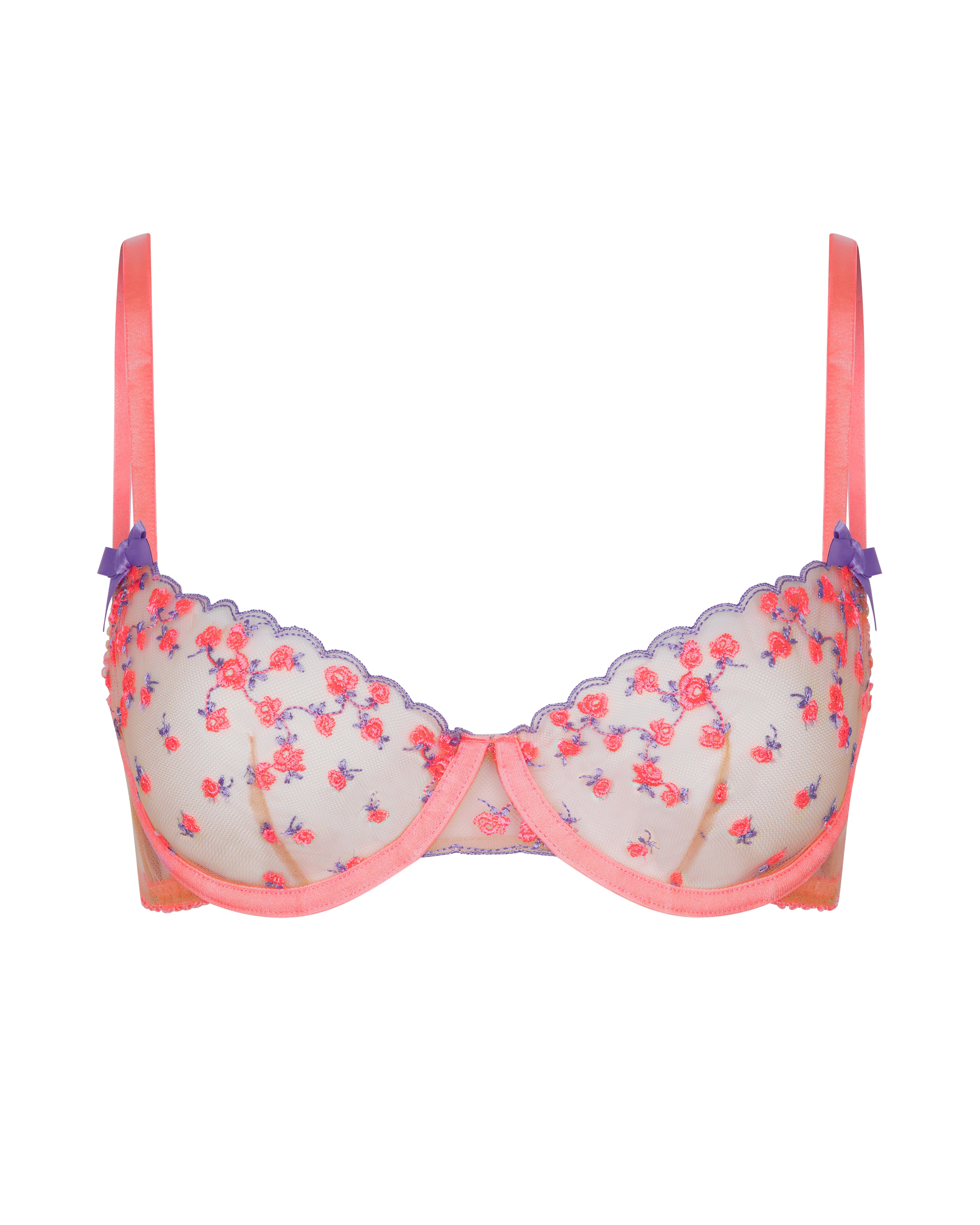 Бюстгальтер Lissa в розово-сиреневой гамме с австрийской вышивкой: мелкоузорчатый цветочный принт и миниатюрный рубчик по краю декольте. Чашки с вытачками и «плавающей» косточкой создают минималистичный силуэт. Шелковая изнанка косточек, декоративная эластичная отделка, позолоченная фурнитура. Дополните комплектом Lissa для изысканного образа.