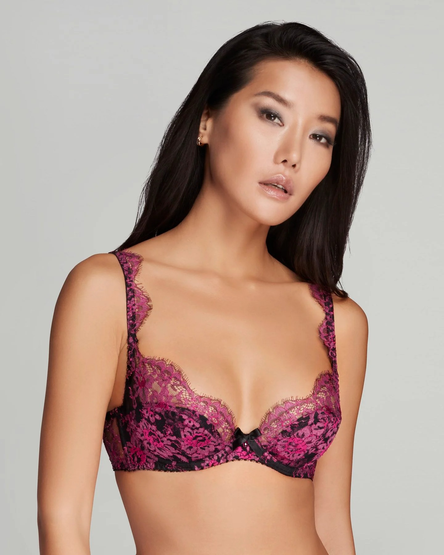 Бюстгальтер с плотной чашкой из коллекции Carline выполнен из черного шелкового атласа. Поверх основы лежит розовое французское кружево ливерс с цветочными мотивами. Фасон на косточках обеспечивает необходимую поддержку. Украшением модели служит фестончатый край кружева и черный атласный бантик в середине с розовой капелькой кристалла Swarovski.