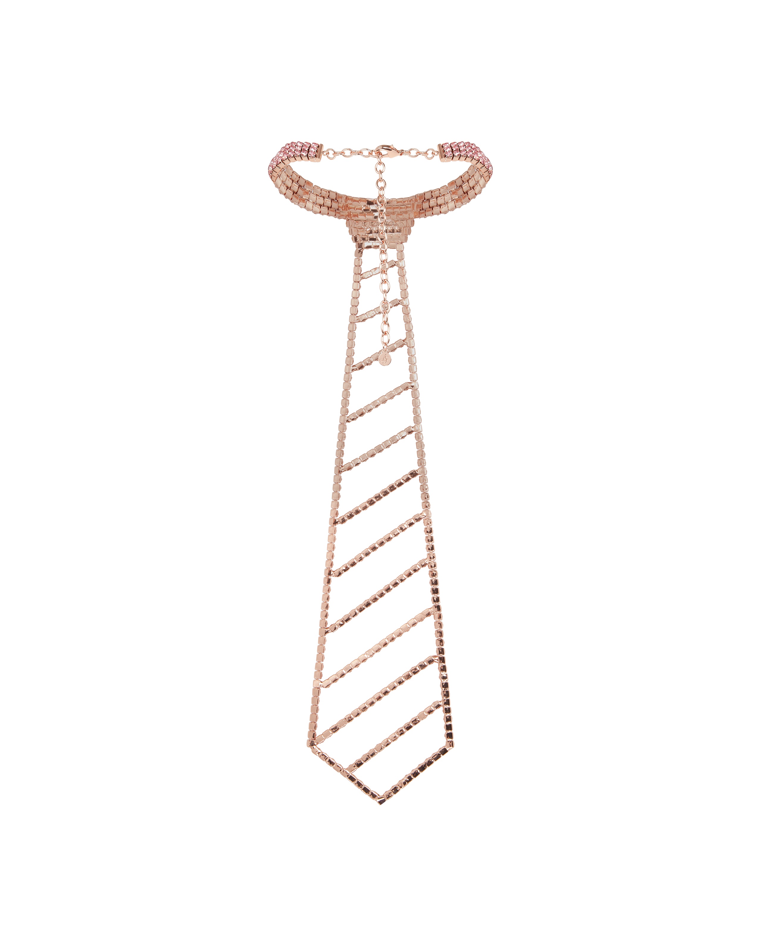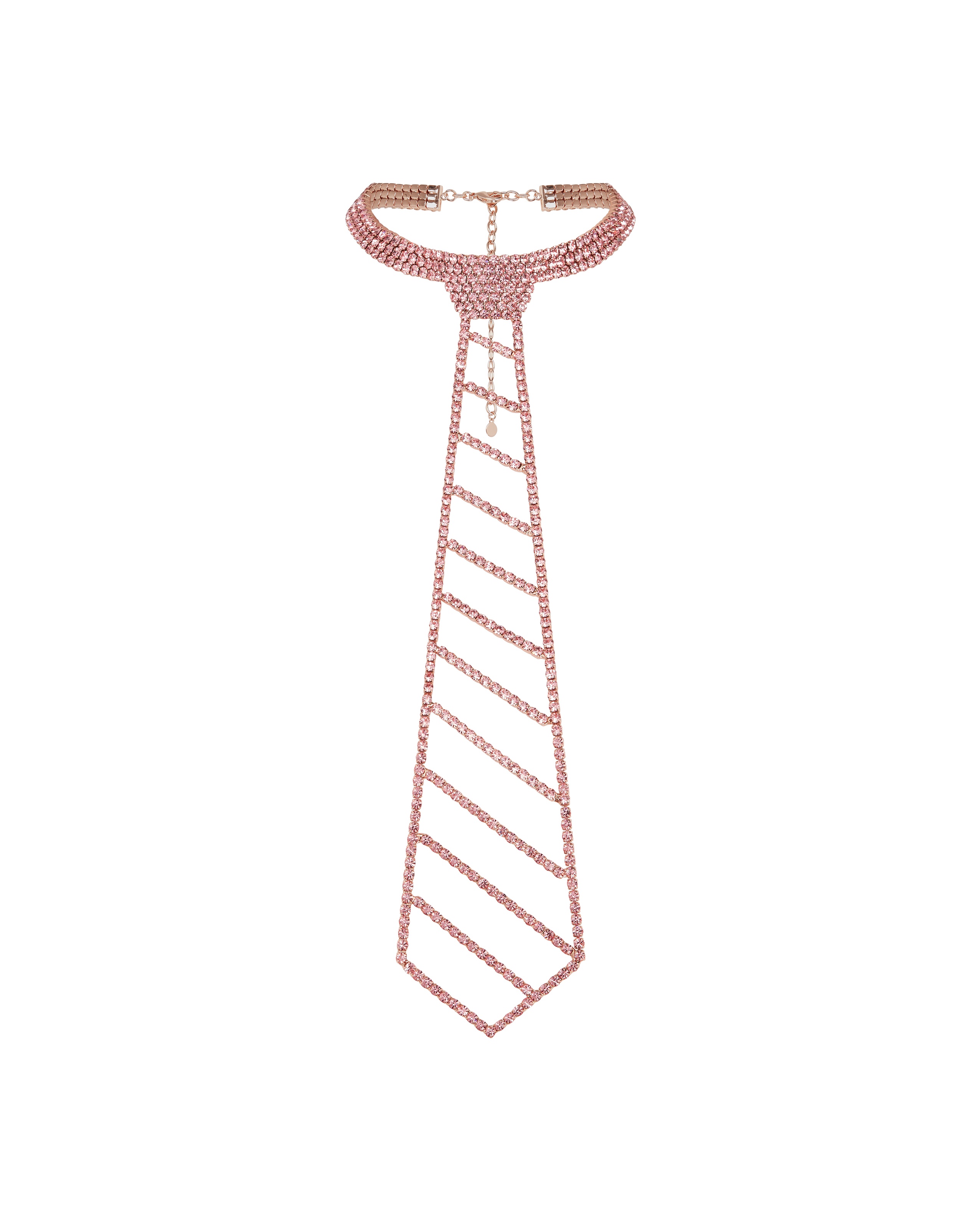Розовый галстук Zoelle: полоска, мерцающая розовыми кристаллами, и нежная розово-золотая цепочка. Регулируемая застежка и диск с логотипом AP как финальный штрих. Игривый и роскошный аксессуар для смелого образа.