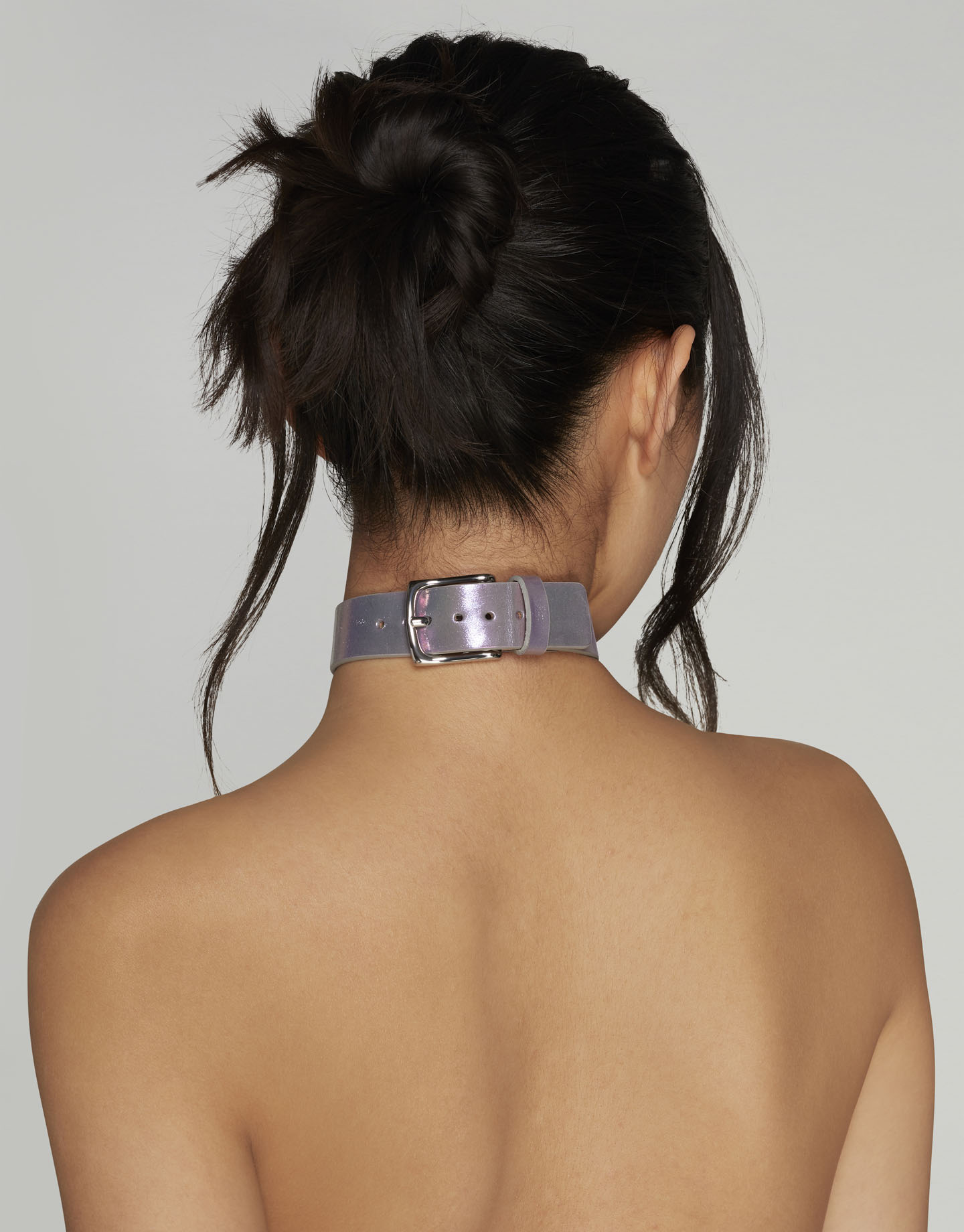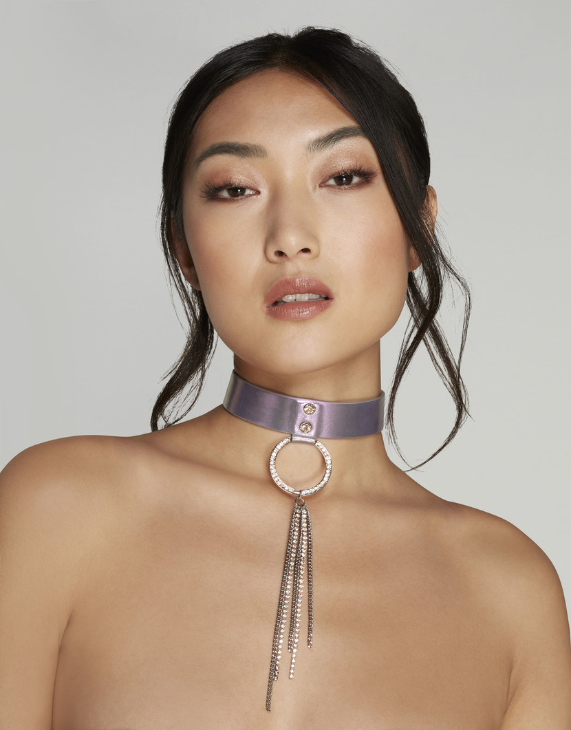 Лиловый чокер Nirvana выполнен вручную мастерами из Англии. Натуральная кожа с перламутровым покрытием дополнена подвеской спереди. Кольцо с цепочками, инкрустированное кристаллами, крепится на пару блестящих заклепок. Сзади регулируемая стальная пряжка.