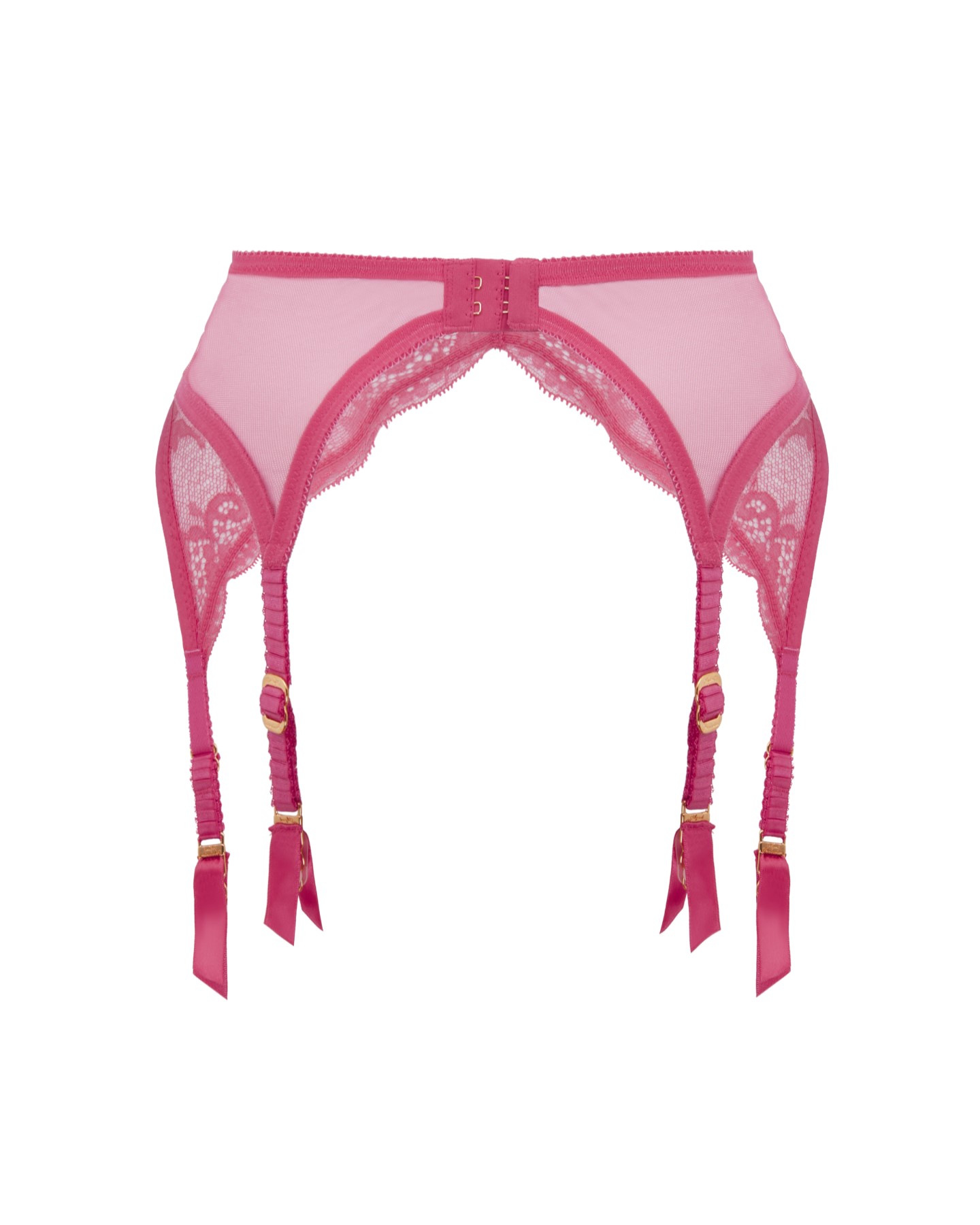 Пояс для чулок Bernie выполнен из розового кружева с растительным мотивом. Фестончатый край образует треугольную форму, переходя в эластичные пажи. Вставки сзади сделаны из тонкого полупрозрачного тюля. Изделие дополнено фирменной золотистой фурнитурой.